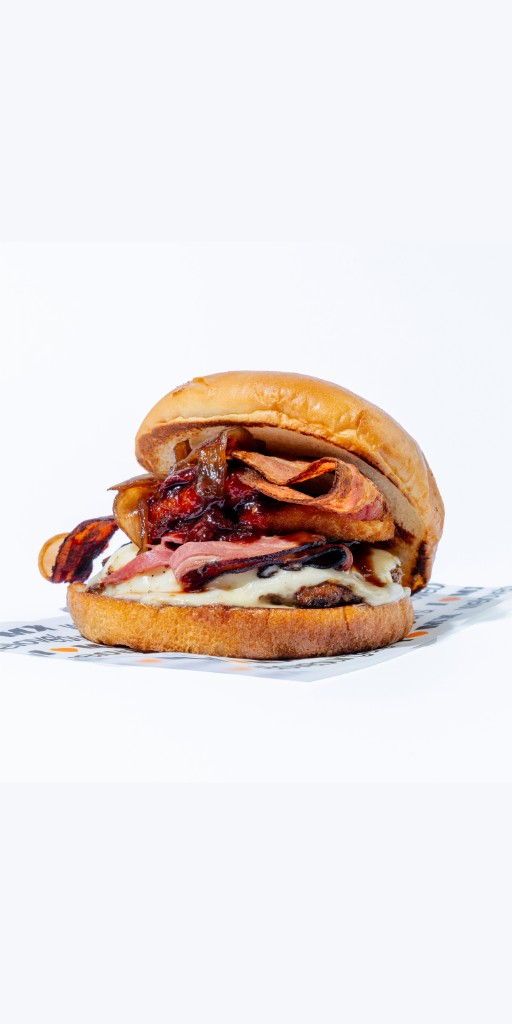 Pan brioche, mayonesa, doble carne de res (100g)* smashed, mayonesa, cebolla blanca, tocino (40gr)* y fondue de jalapeño.