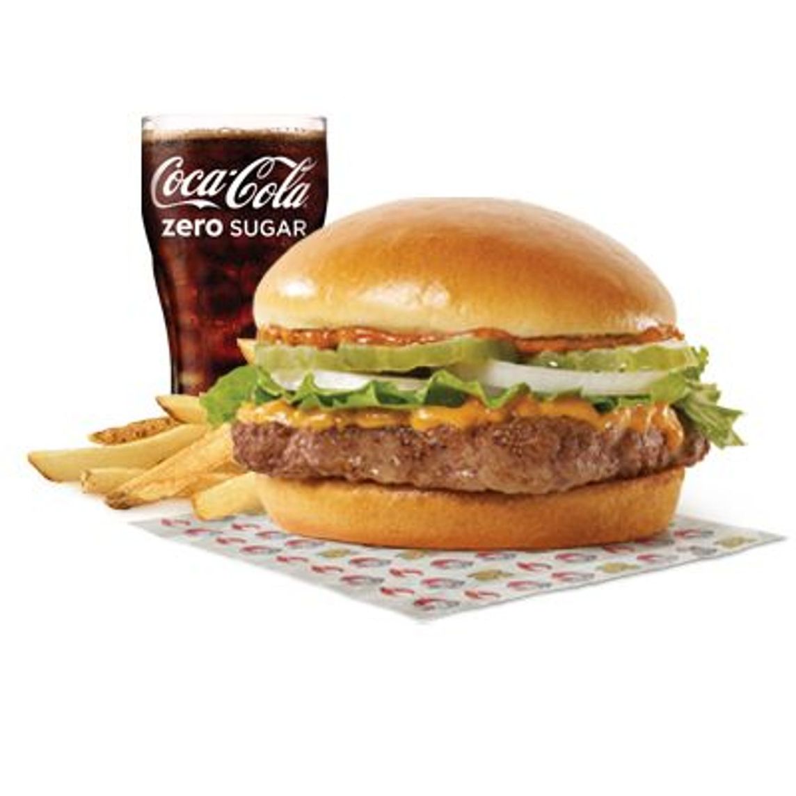 Tres cuartos de libra de carne de res fresca, queso americano, lechuga fresca, tomate, pepinillos encurtidos, cátsup, mayonesa y cebolla en un pan brioche tostado. Acompañado de papas fritas medianas y refresco de 600 ml.