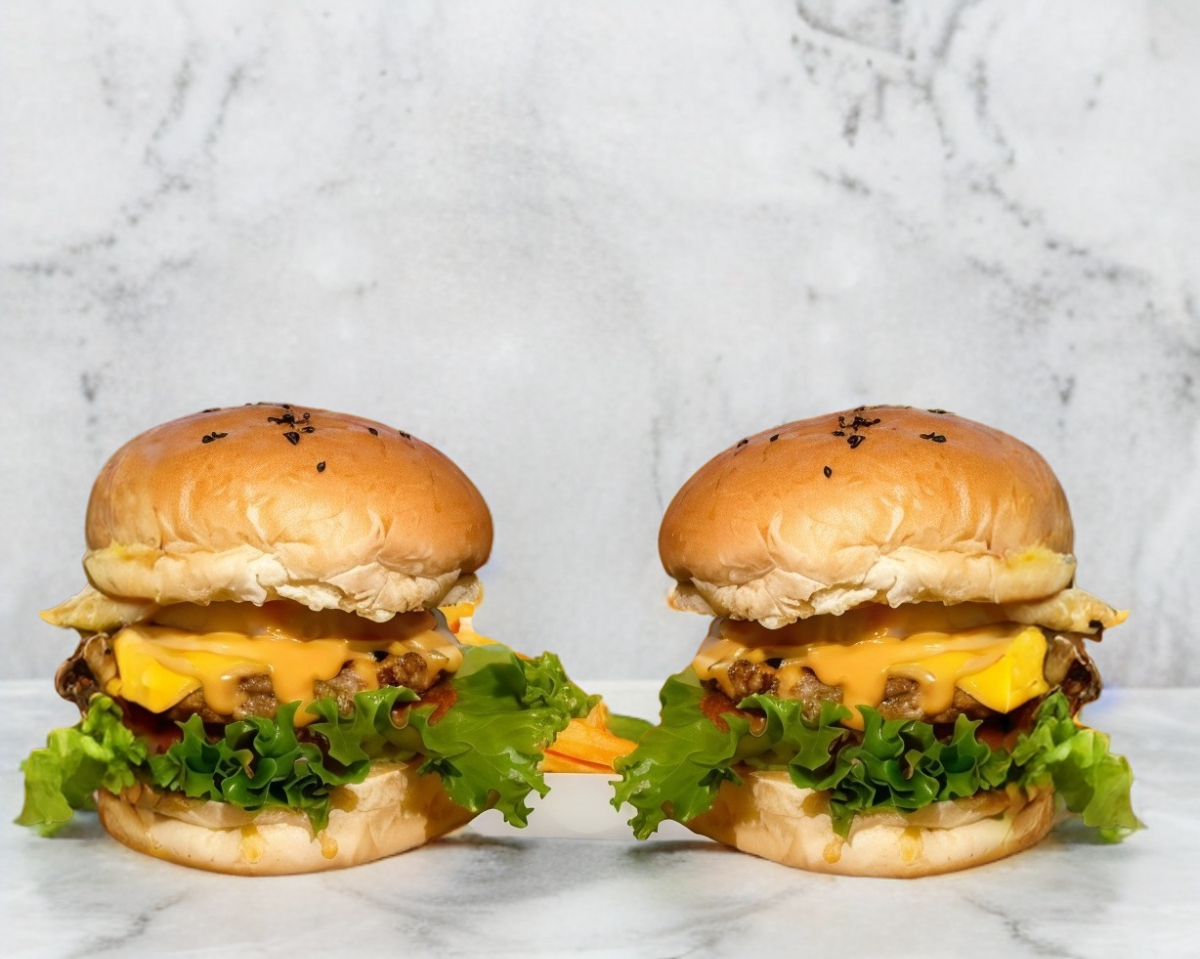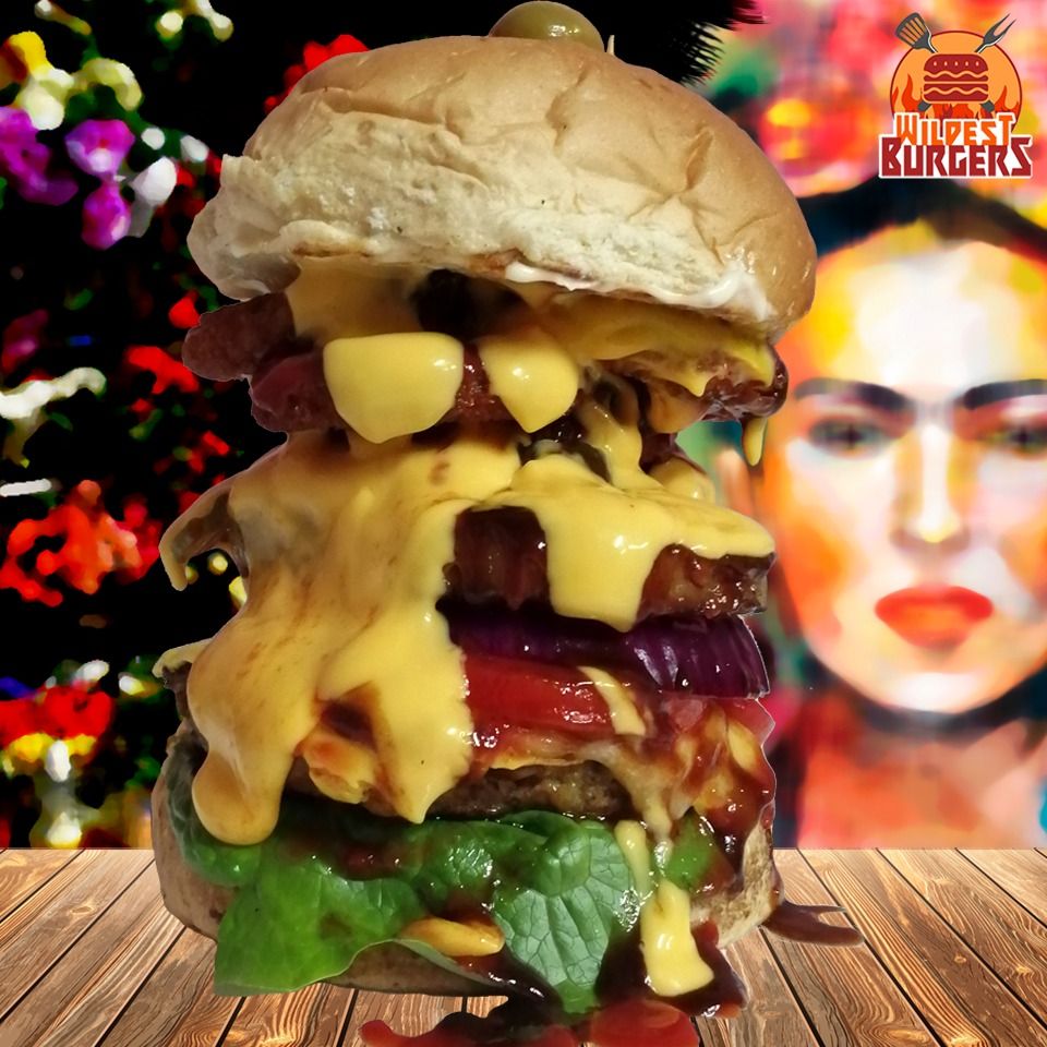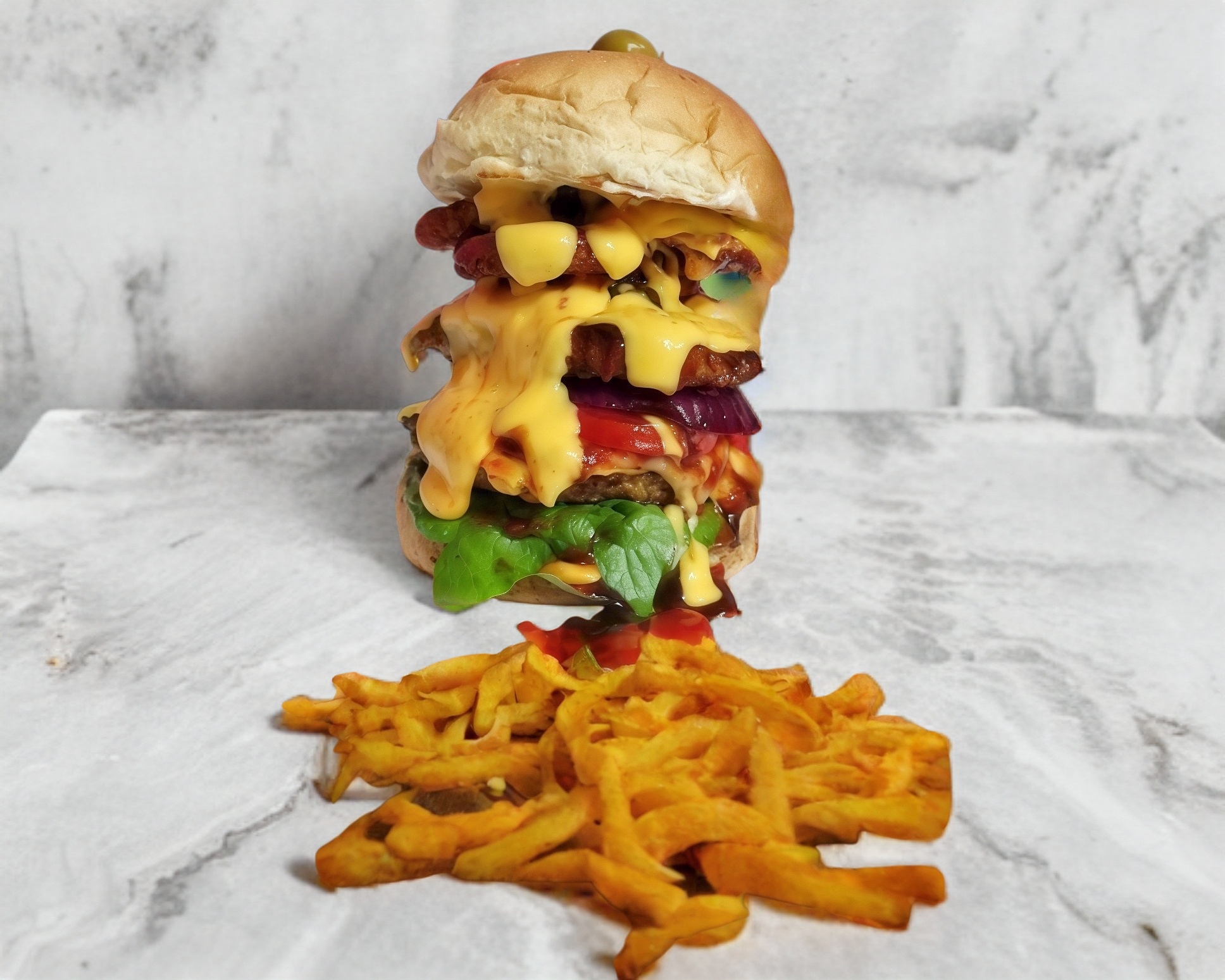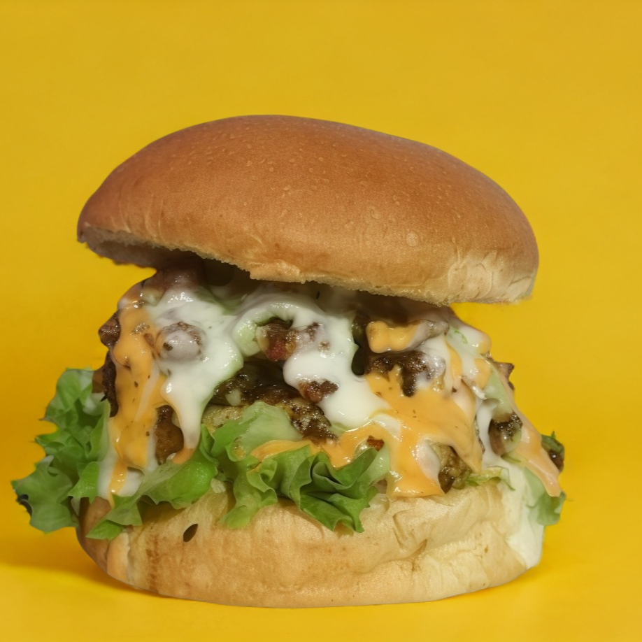 Pan artesanal, doble carne casera de 160 gramos, lechuga italiana, queso americano, queso manchego, champiñones, aros de cebolla, tocino, mayonesa, salsa chipotle.