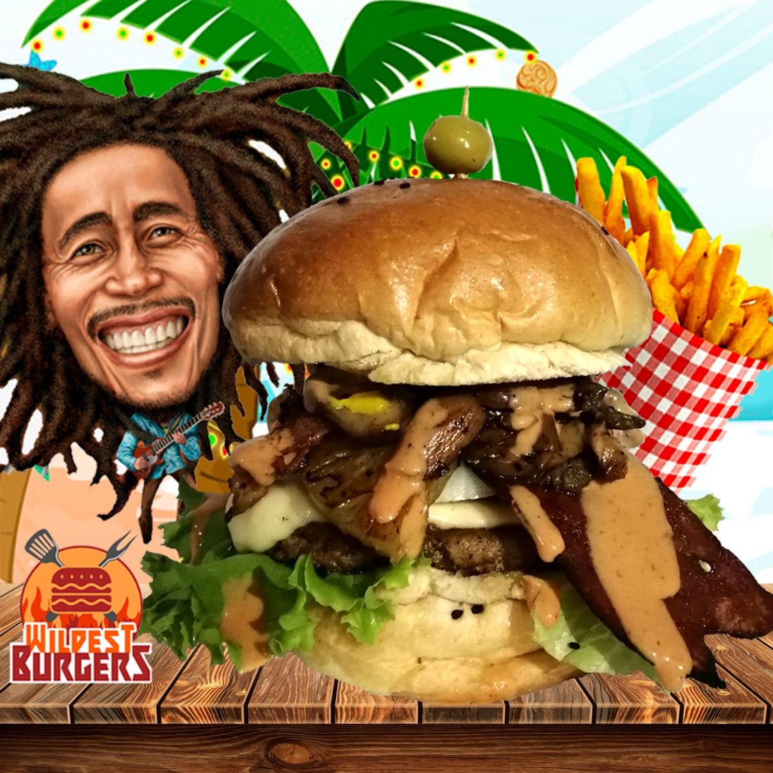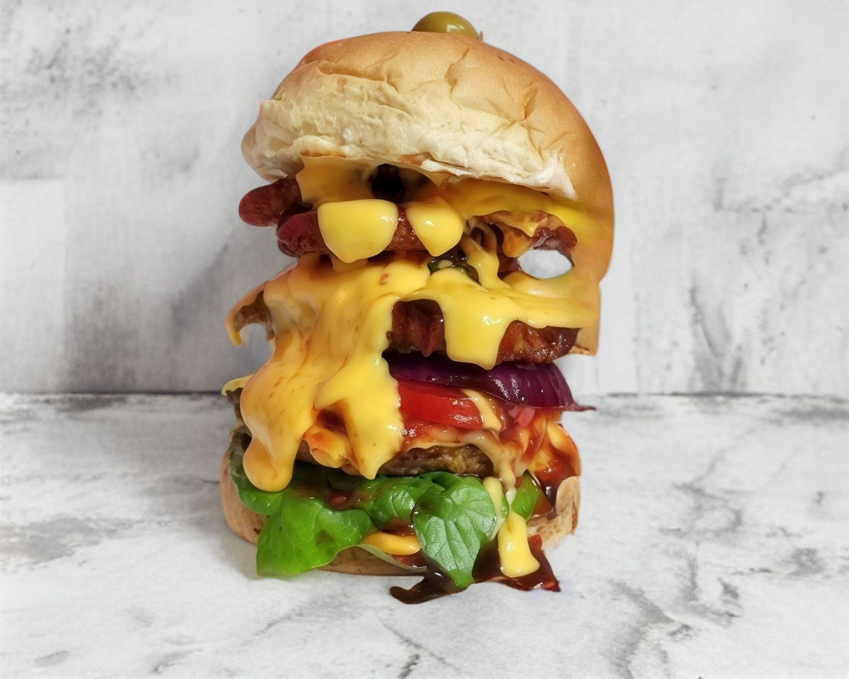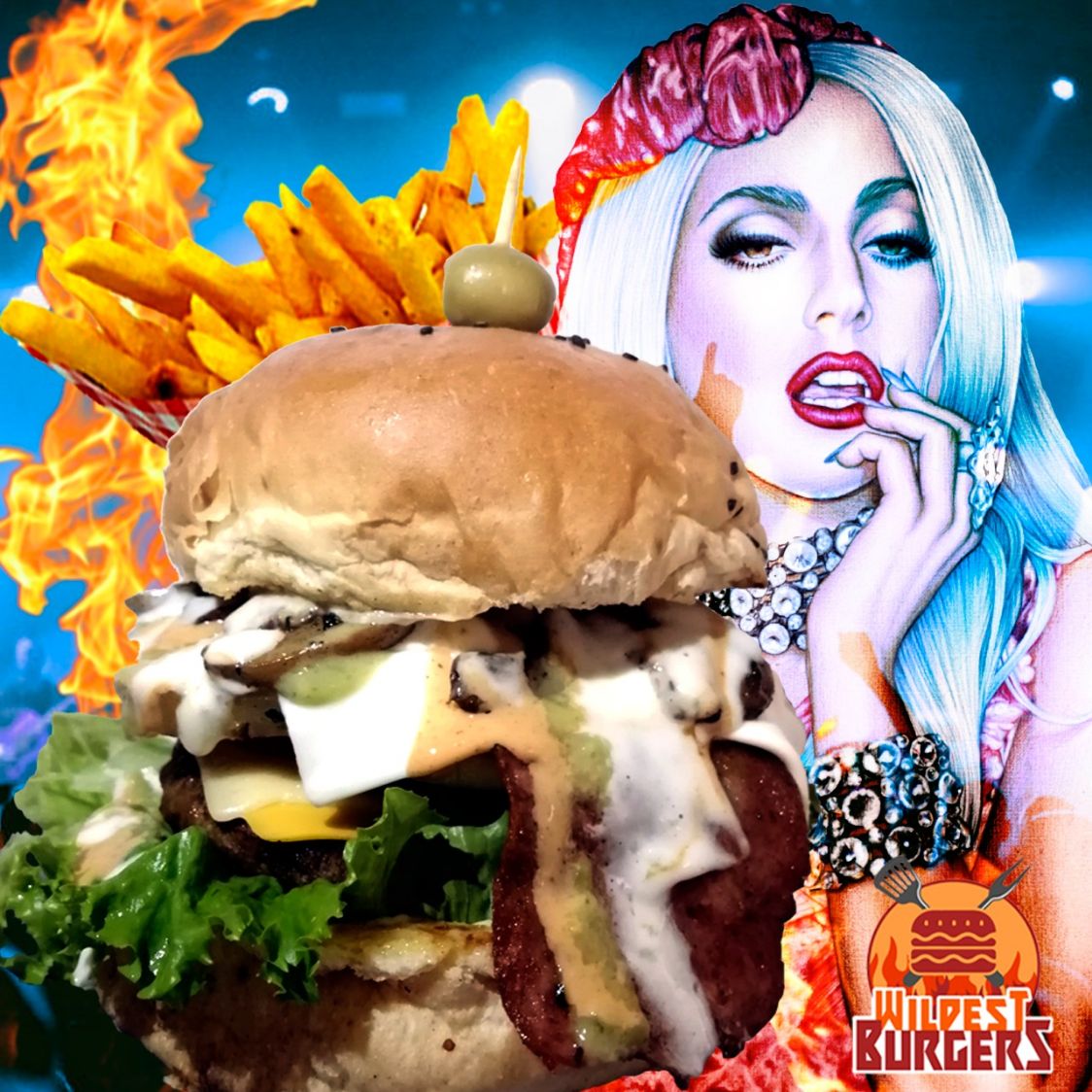 Pan artesanal, doble carne casera de 160 gramos, lechuga italiana, queso americano, queso manchego, champiñones, aros de cebolla, tocino, mayonesa, salsa chipotle.