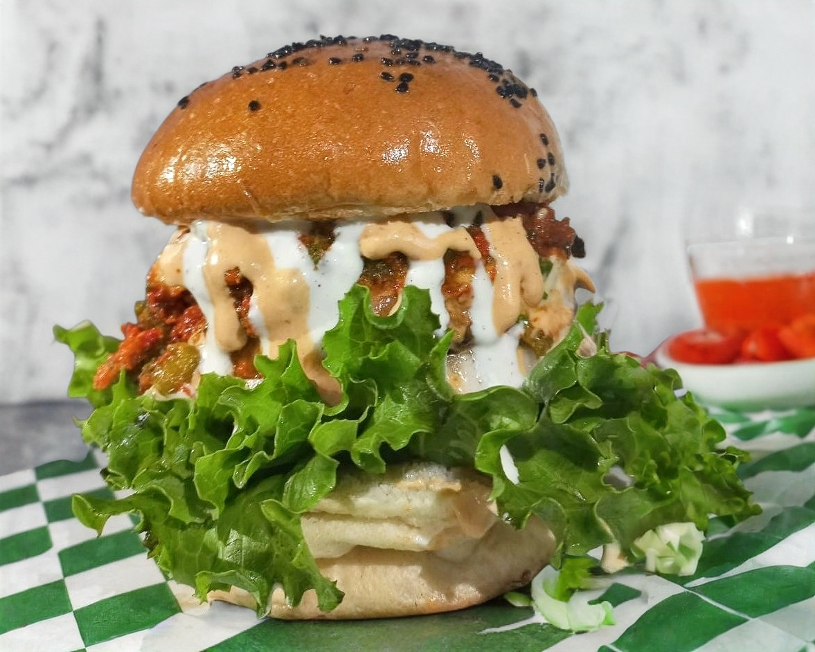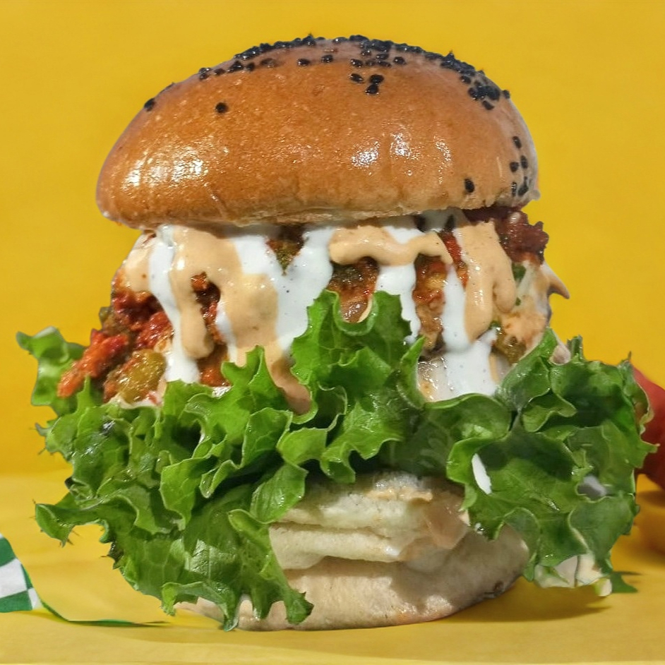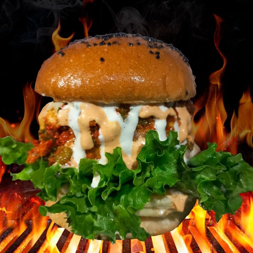 Pan artesanal, carne casera de 160 gramos, lechuga italiana, carne árabe con chorizo rojo y verde, salsa chipotle (Picosita), salsa ajo