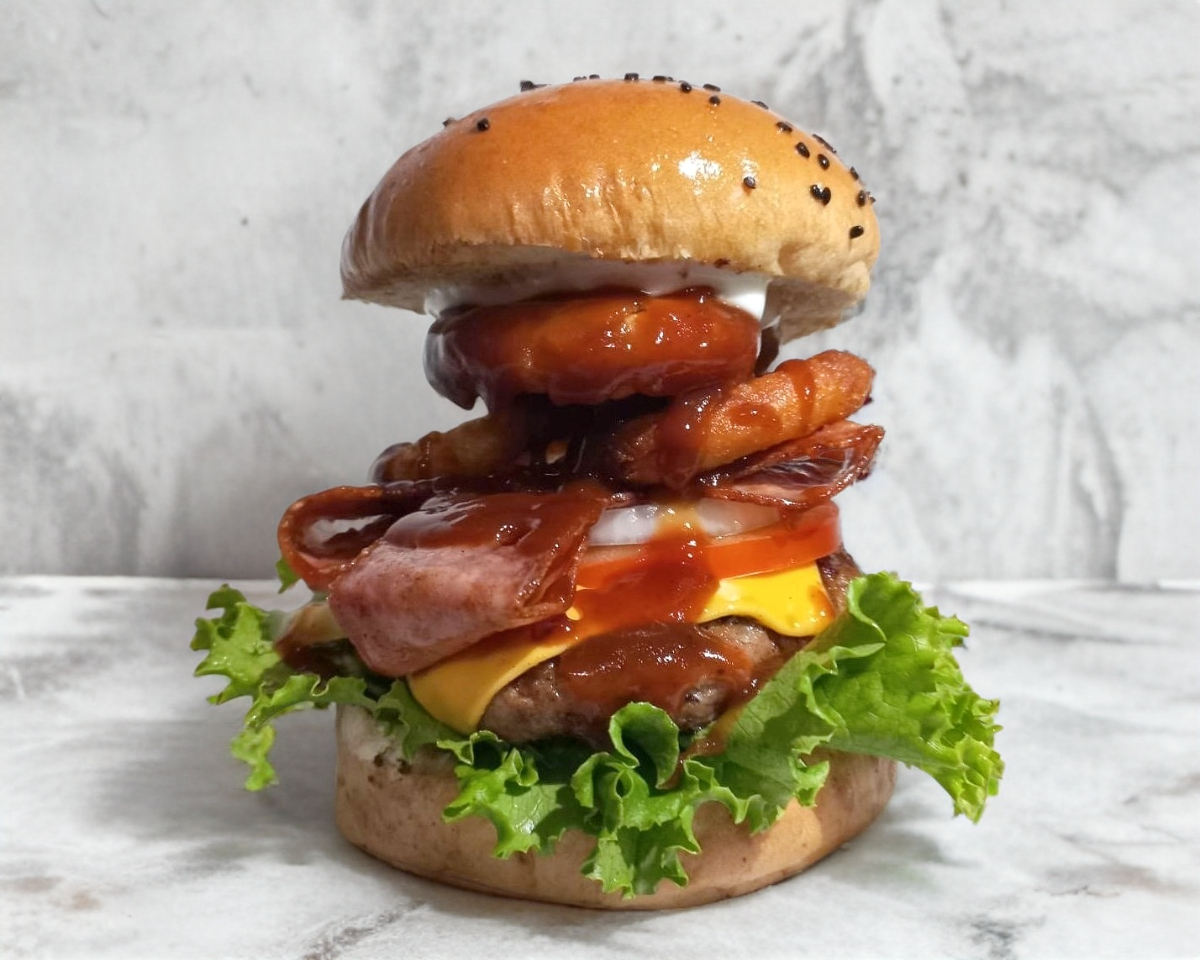 Carne, queso americano, lechuga italiana, tocino, aros de cebolla, mayonesa y salsa bbq