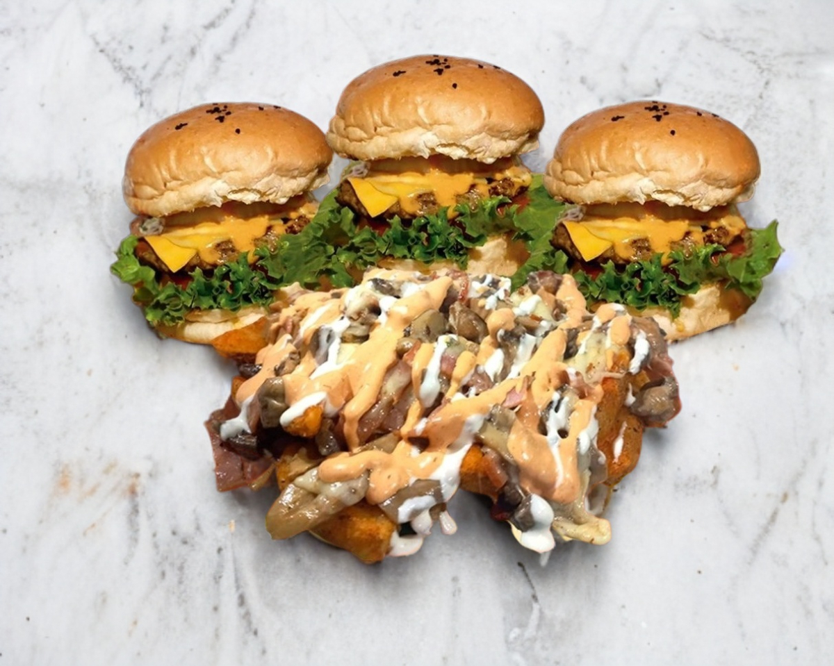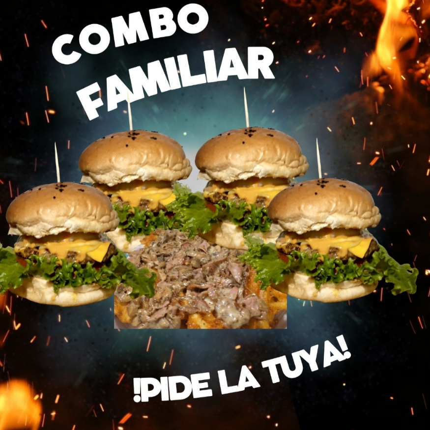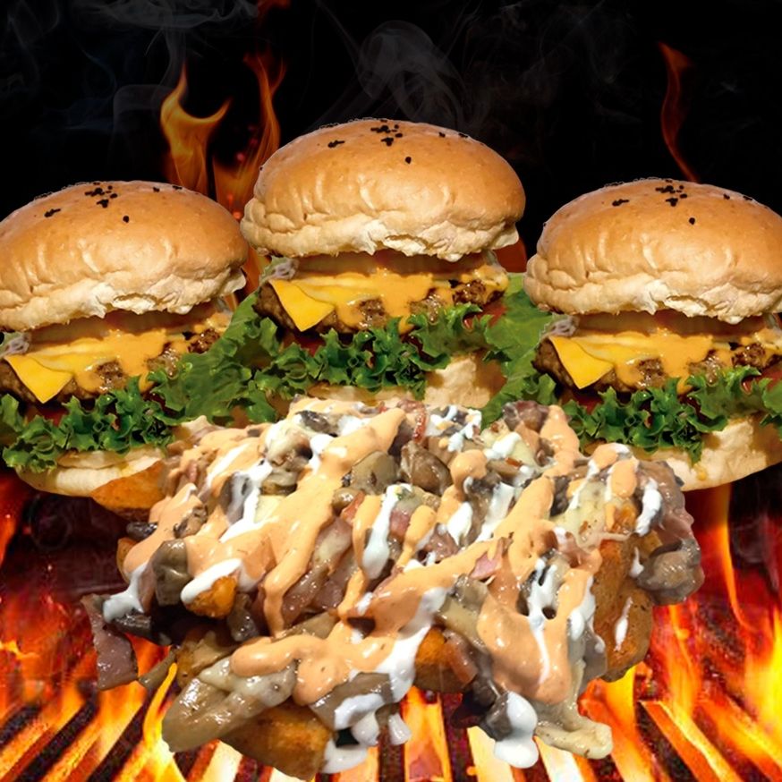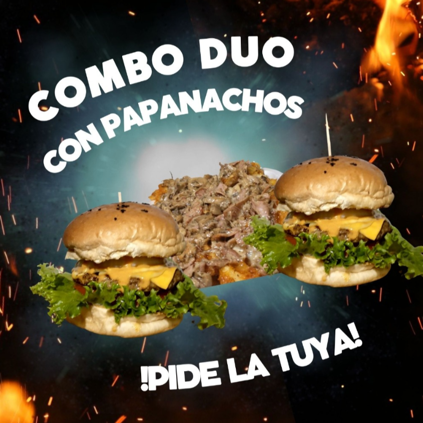 2 burgers con papanachos grandes con salsas de ajo y chipotle