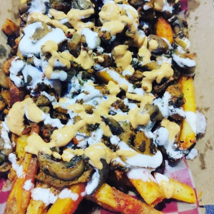 Orden grande de papas para compartir de 450grs, carne árabe 250grs, champiñones y salsa de ajo y chipotle