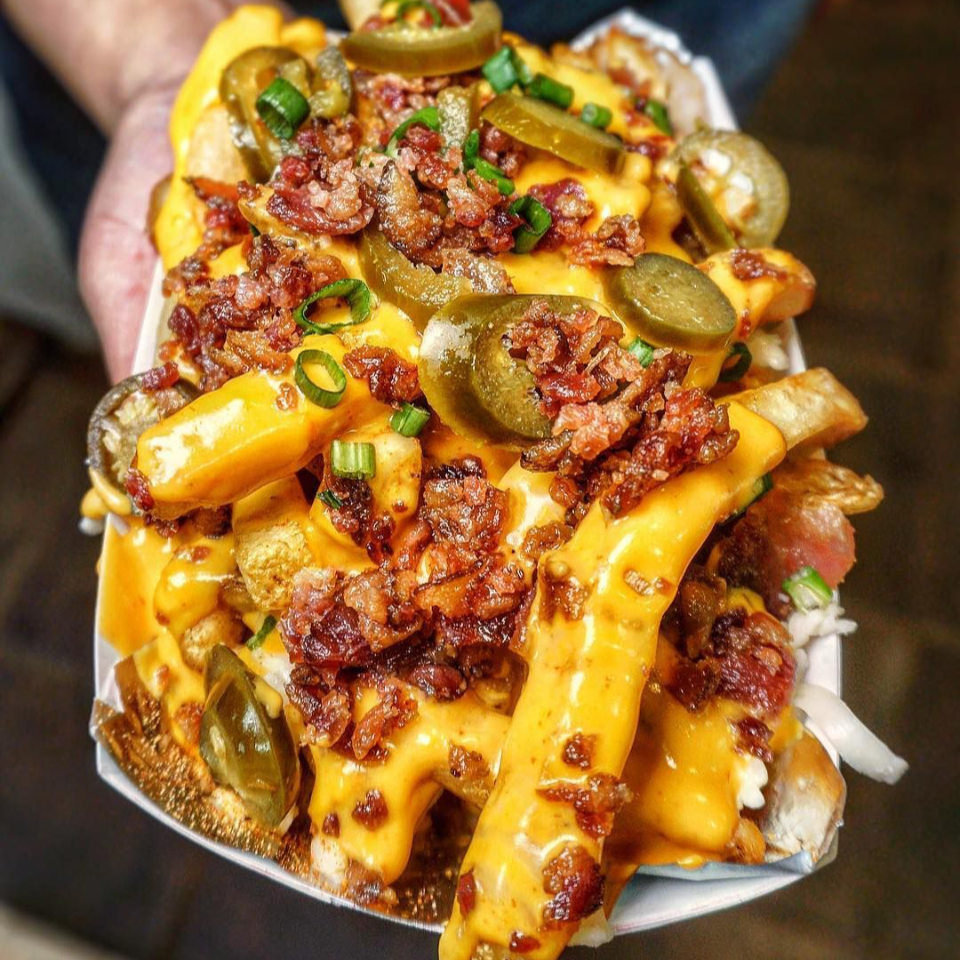 Papas a la francesa bañadas con queso cheddar, trocitos de tocino y jalapeños.