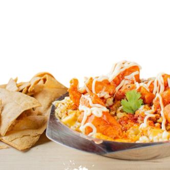 Crujientes totopos con carne de pollo, queso derretido, frijoles, granos de elote, pico de gallo, jalapeños y nuestro delicioso aderezo.