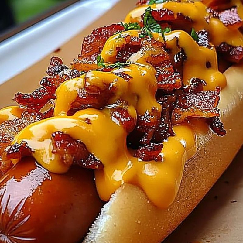 Deliciosa salchicha de res, bañada con queso cheddar y tocino, una delicia.Acompañado con porción de papas fritas aparte (110 grs)