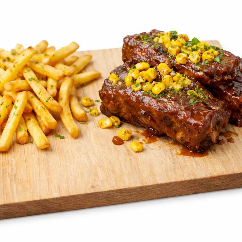 Costillas de cerdo (350 gr), bañadas con salsa de tu preferencia , acompañadas de elote sazonado y papa de la casa.