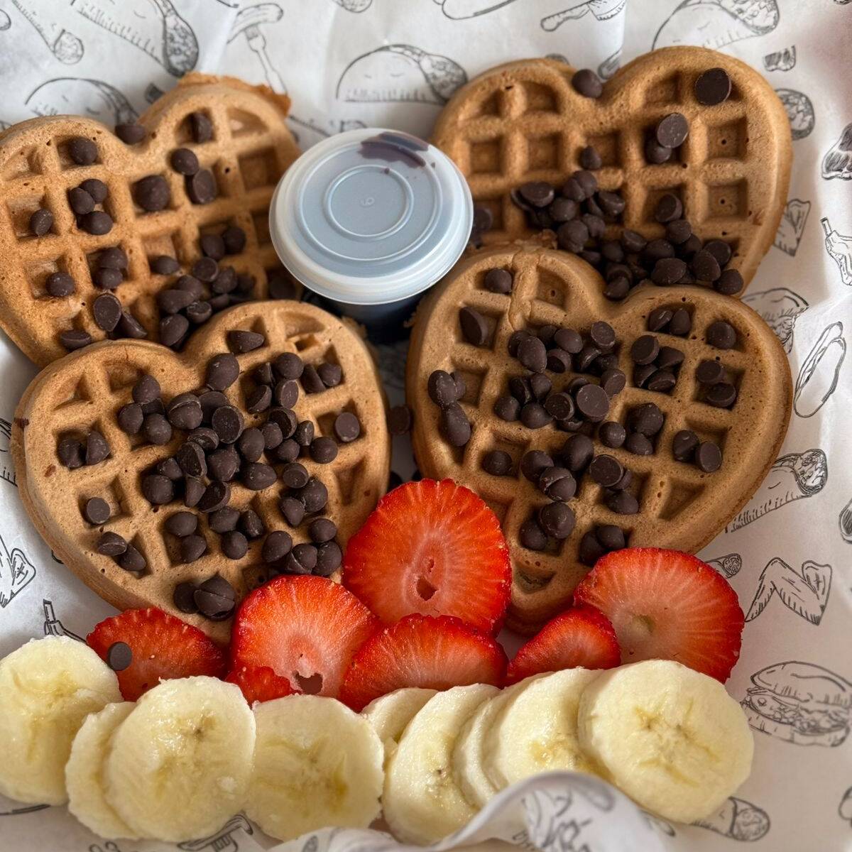 4 miniwaffles de corazon con chispas de chocolate, trozos de fresa y platano y Miel