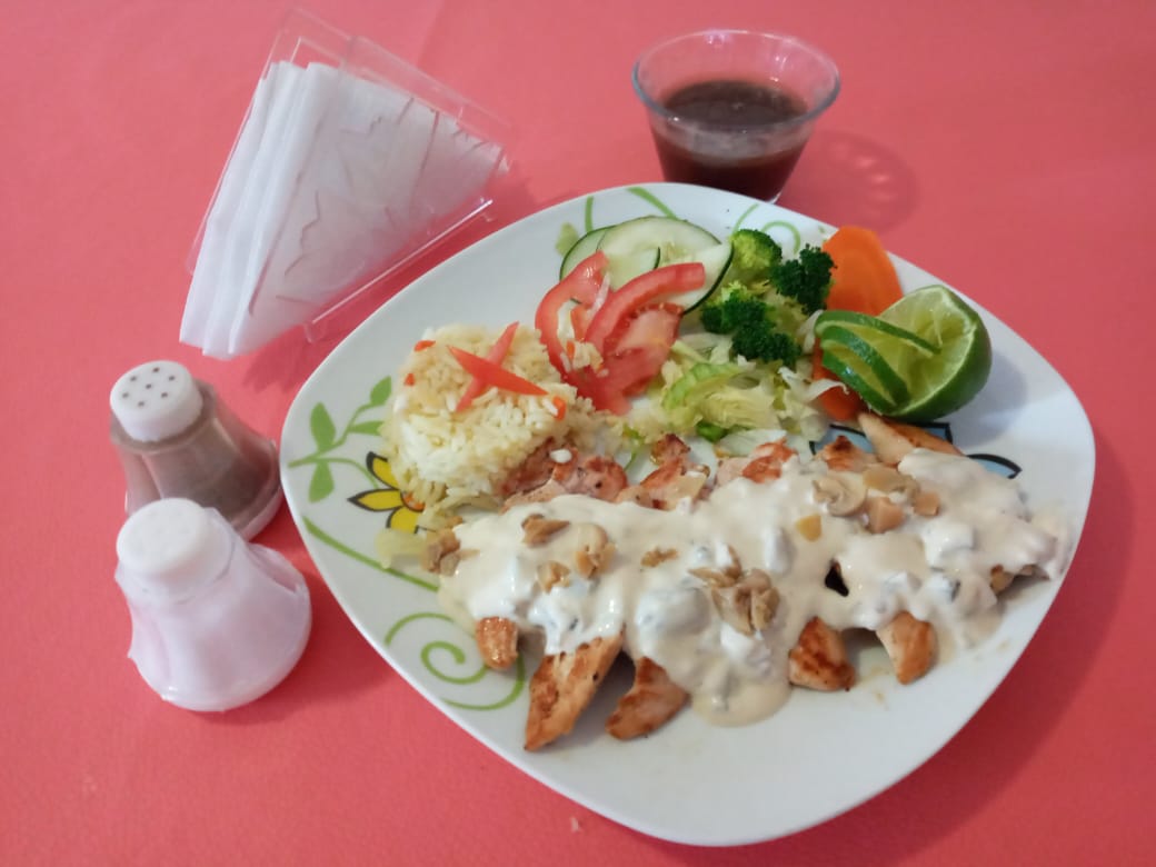 Pechuga de pollo asada, bañada en salsa cremosa de champiñones, acompañada de arroz, frijol y ensalada de vegetales.