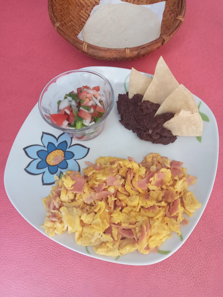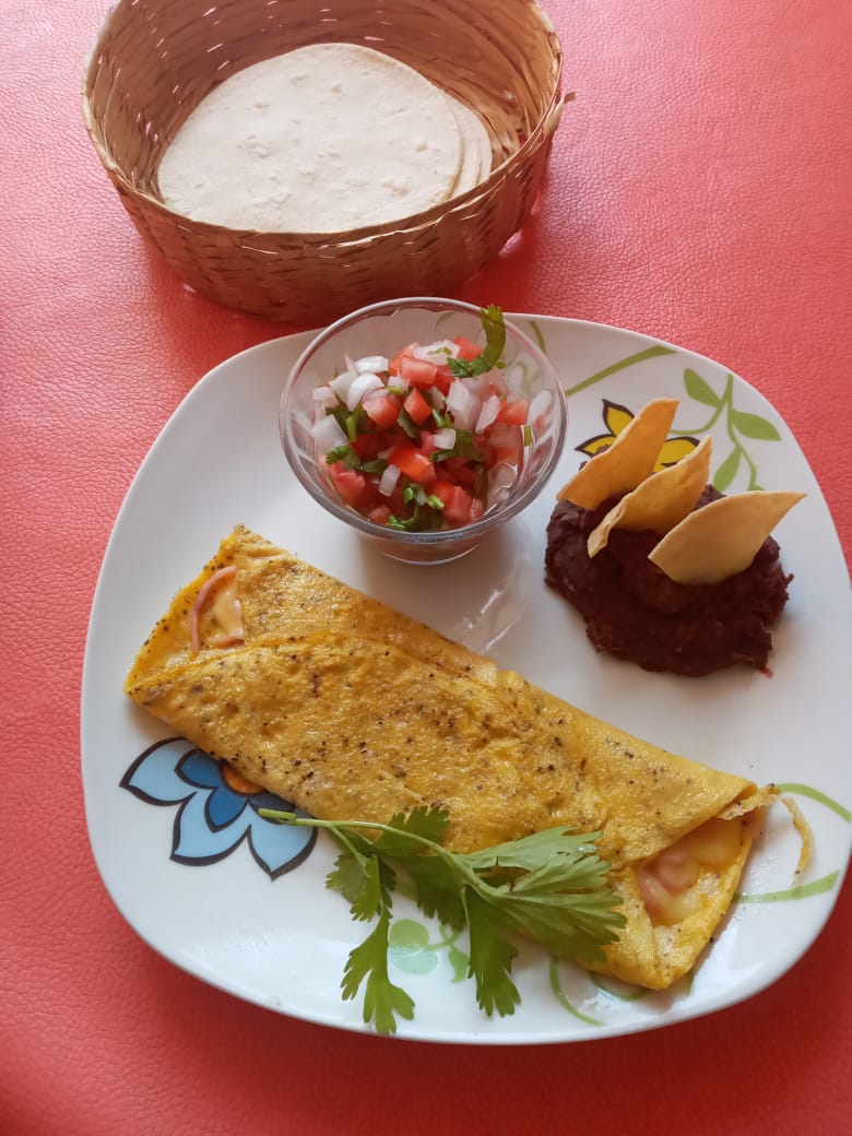 Omelette de huevo, servido con frijol refrito con totopos, y acompañado de salsa pico de gallo, tortillas y salsa picante