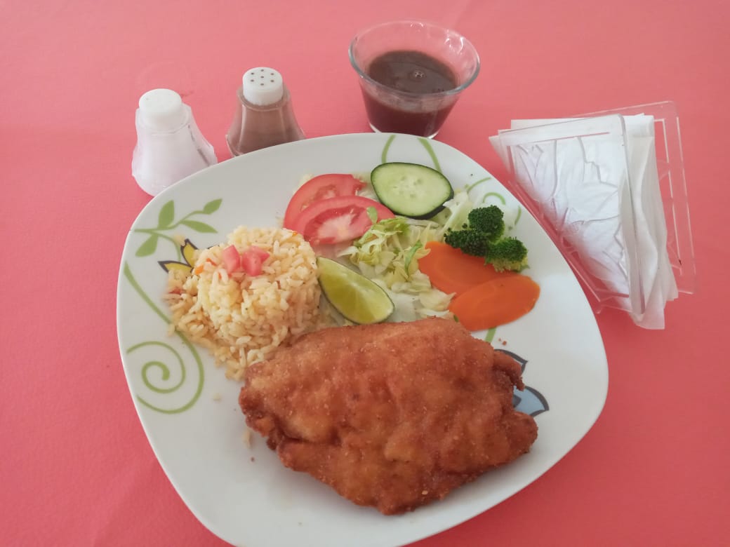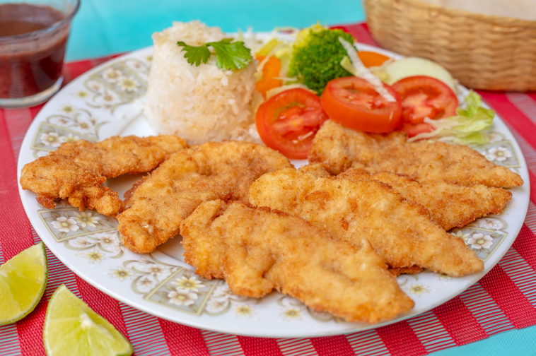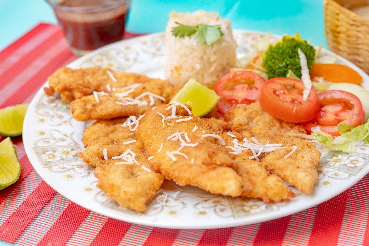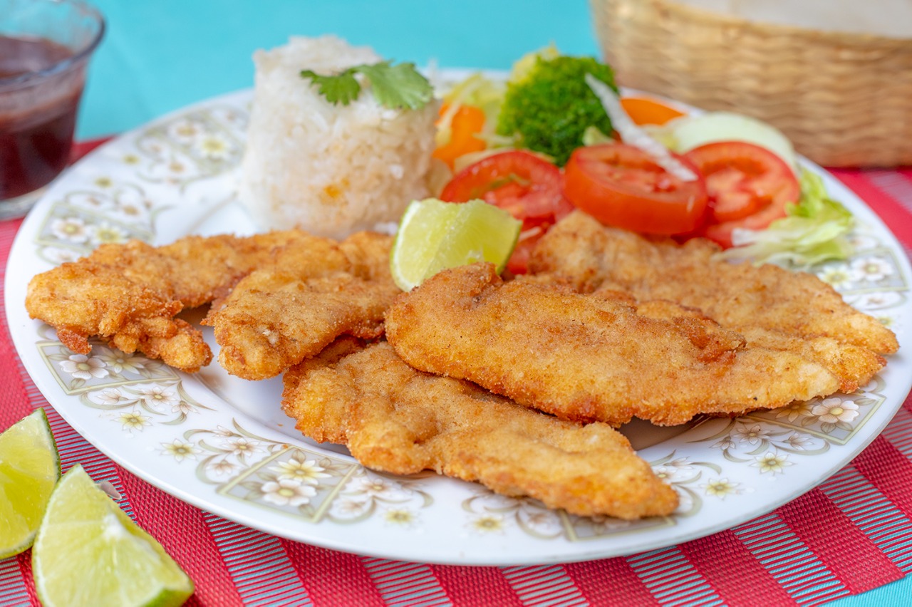 Pechuga de pollo empanizada con harina dulce y ralladura de coco, acompañada de arroz, frijol y ensalada de vegetales.