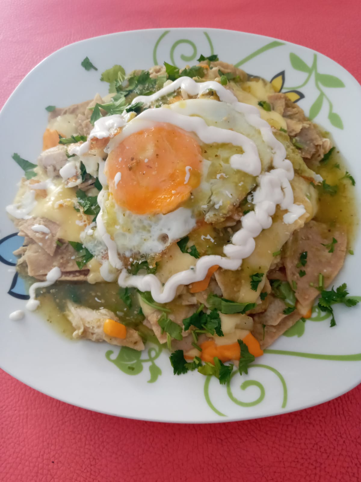 Chilaquiles con pollo, crema y romanita, bañados con salsa a elegir.
