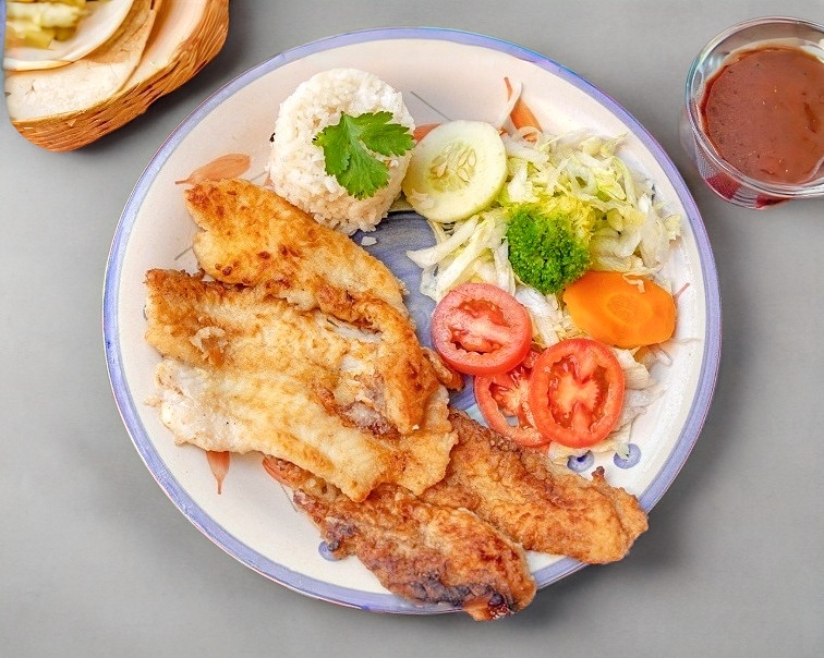 Filete de pescado a la plancha, bañado en salsa cremosa de queso, acompañado de arroz, frijol y ensalada de vegetales.