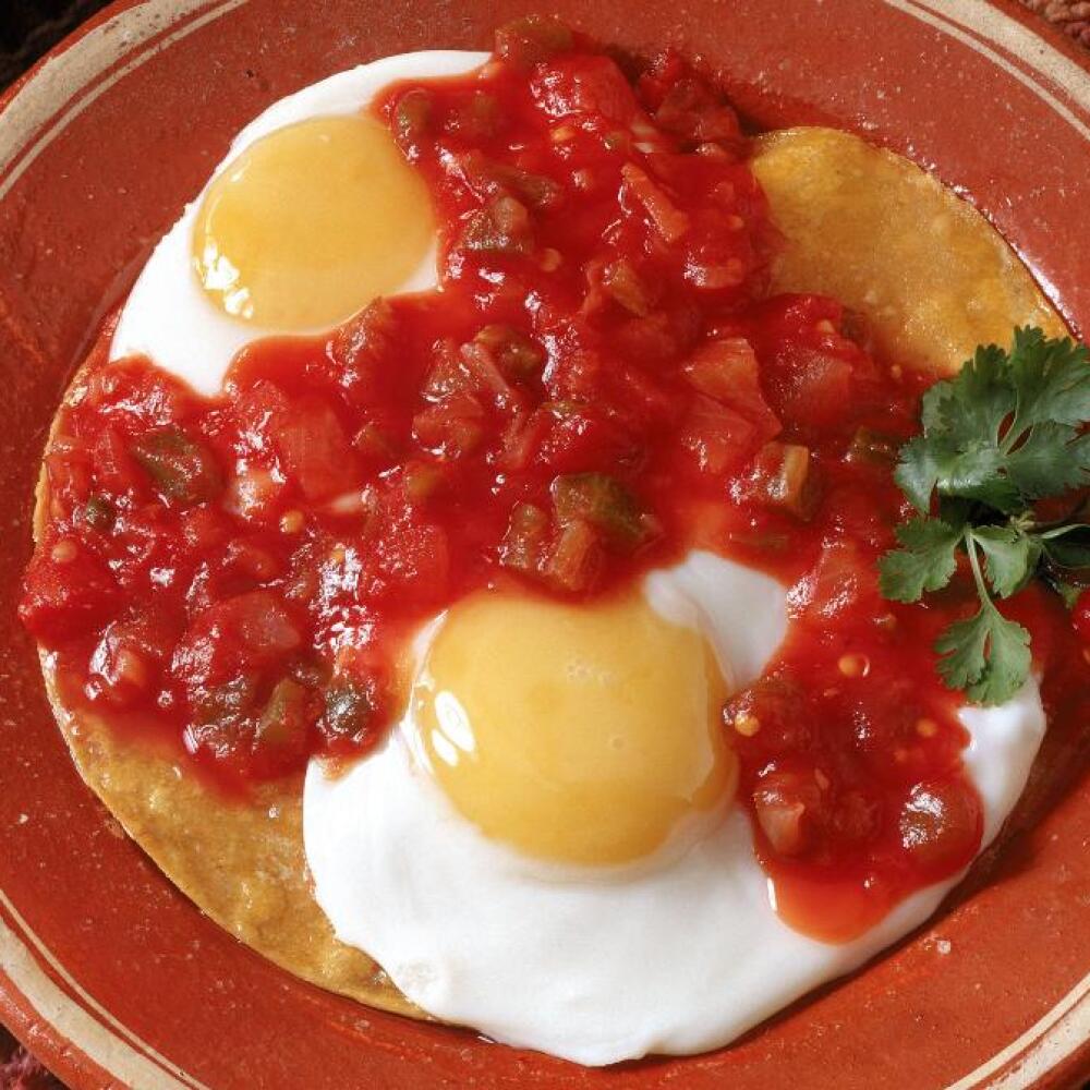 Orden con 2 Huevos estrellados sobre tortillas de maíz levemente fritas, bañados en salsa de tomate roja y acompañados de frijol refrito con totopos y salsa picante.