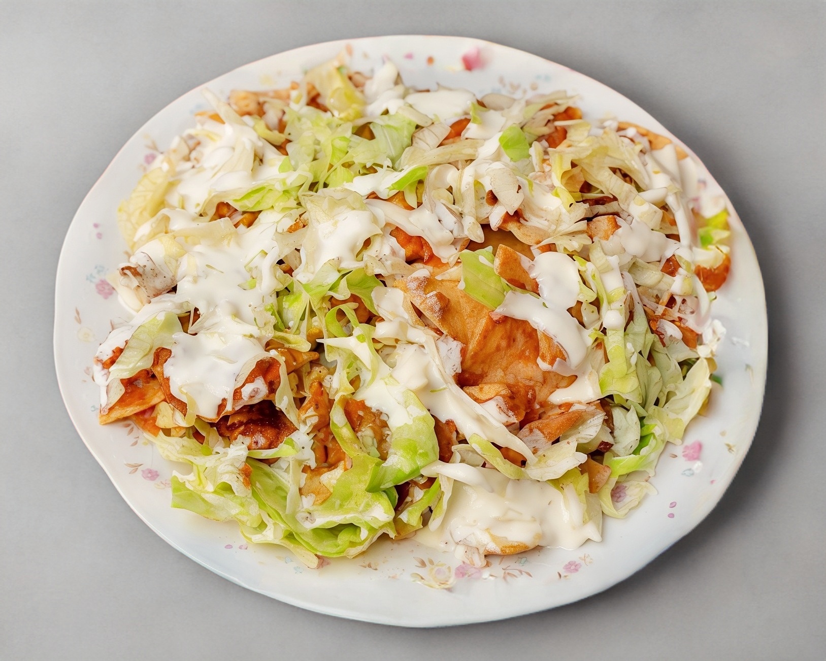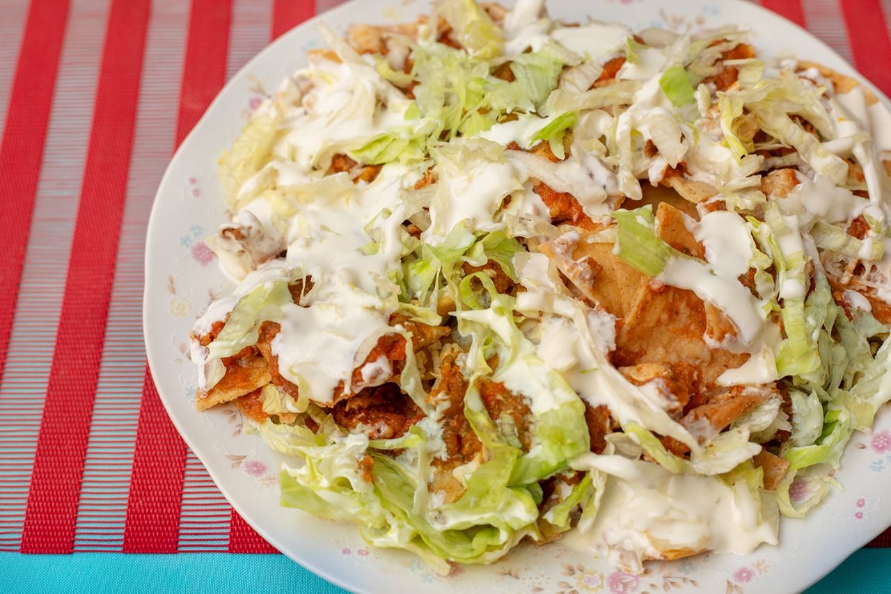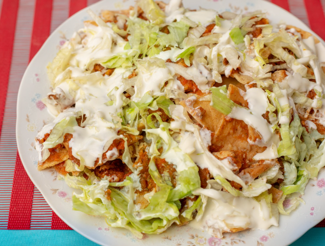 Tradicionales chilaquiles hechos con totopos, pechuga de pollo deshebrada, salsa de tomate a elegir, lechuga romana fresca, crema, queso, cebolla y cilantro.