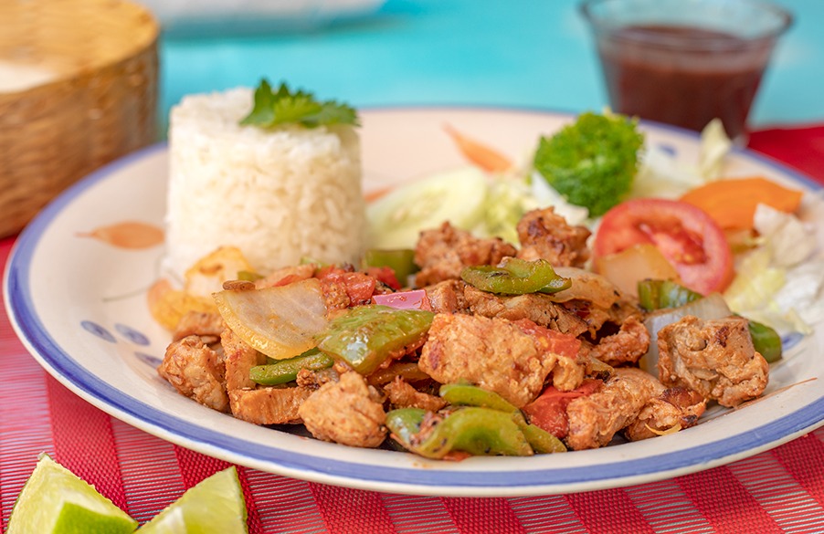 Carne de cerdo trozada y guisada con pimiento verde, cebolla y tomate, acompañada de arroz, frijol y ensalada de vegetales.