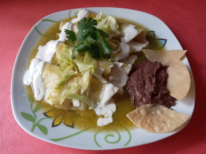 4 Enchiladas de tortilla de maíz, rellenas con pechuga de pollo deshebrada, bañadas en salsa a elegir, y acompañadas de frijol refrito, totopos y salsa picante