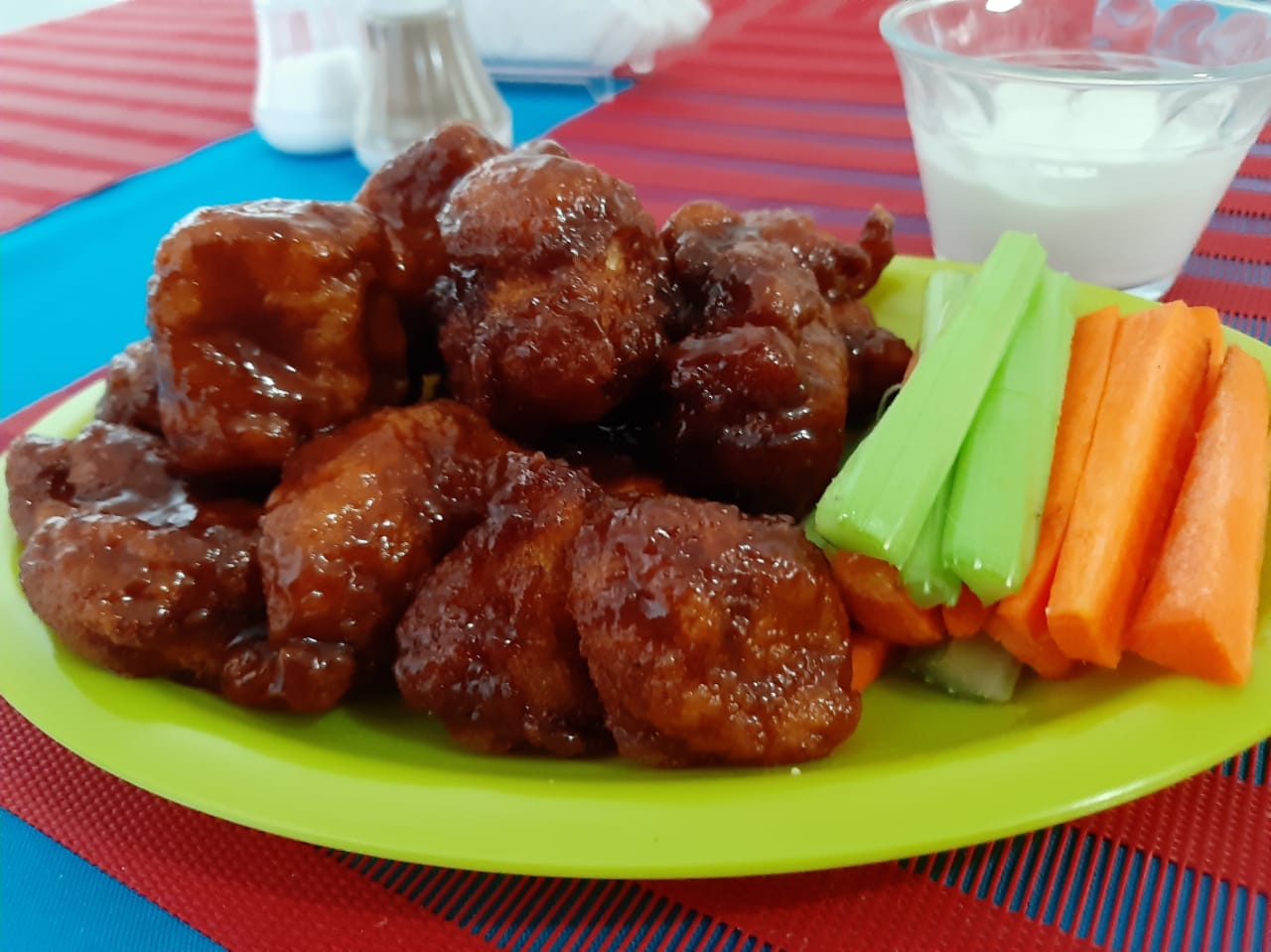 15 piezas de cubitos de pechuga de pollo empanizadas y bañadas en salsa BBQ, acompañadas a elegir, con bastones de apio y zanahoria, o papas a la francesa.