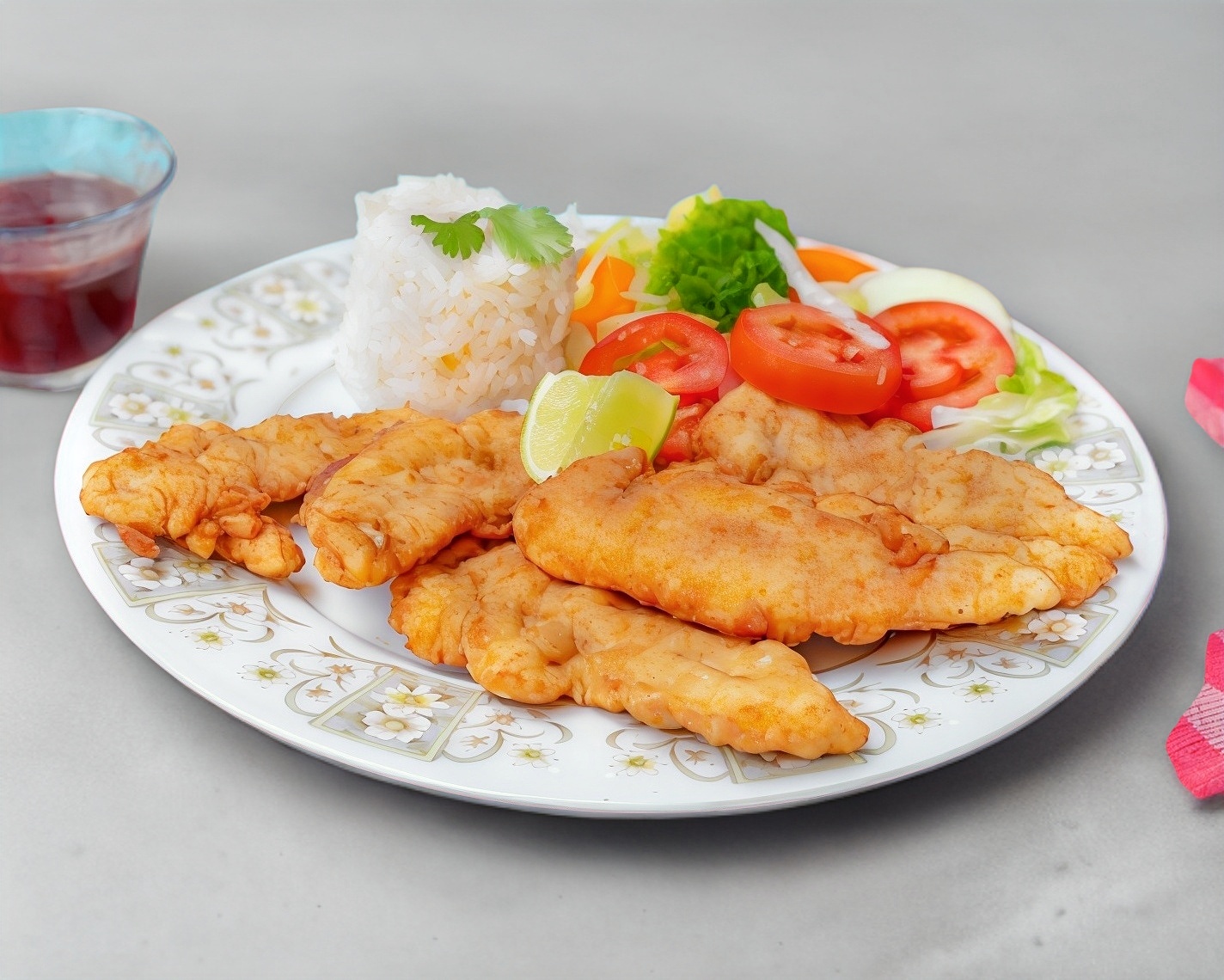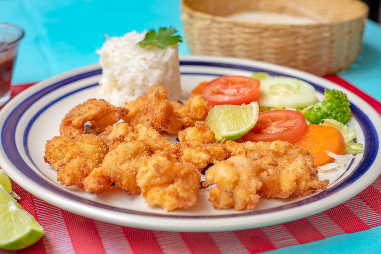 Camarones empanizados y crujientes, acompañados de arroz, frijol y ensalada de vegetales.