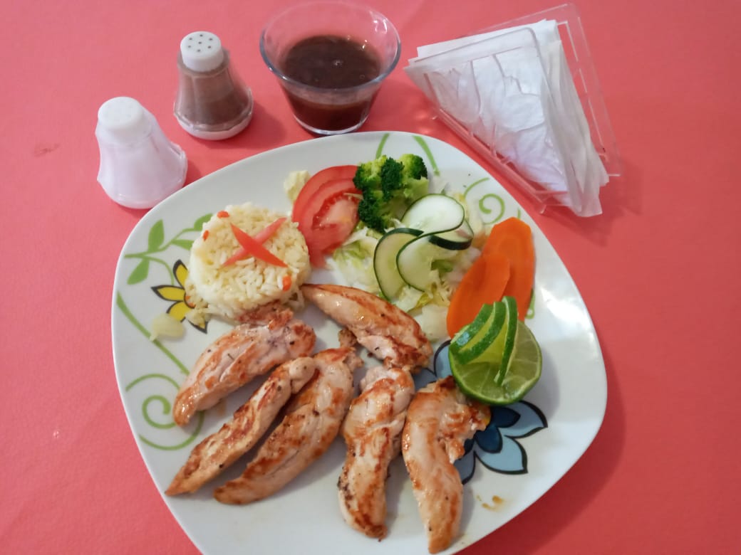 Pechuga de pollo a la plancha, acompañada de arroz, frijol y ensalada de vegetales.