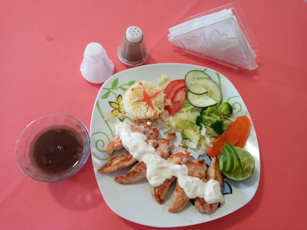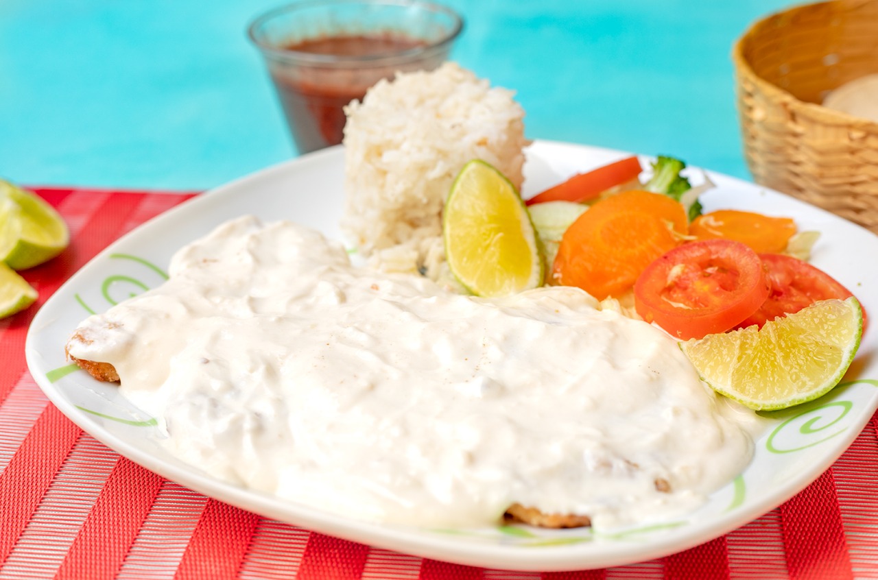 Pechuga de pollo asada, bañada en salsa cremosa de queso, acompañada de arroz, frijol y ensalada de vegetales.