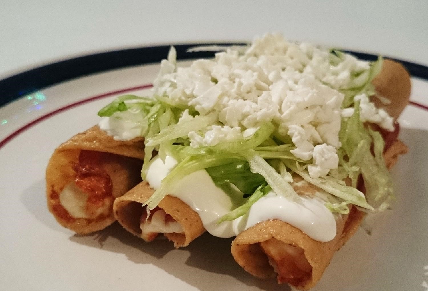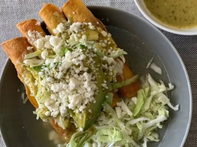 4 Taquitos de tortilla de maíz fritos, rellenos de pechuga de pollo deshebrada, bañados en salsa a elegir, lechuga romana y crema, y acompañados con frijol refrito, totopos y salsa picante.