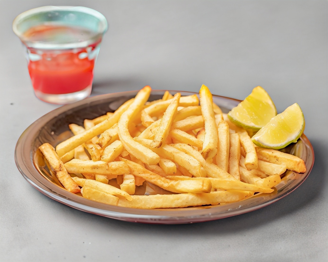 Orden de papas a la francesa con cátsup y limón.