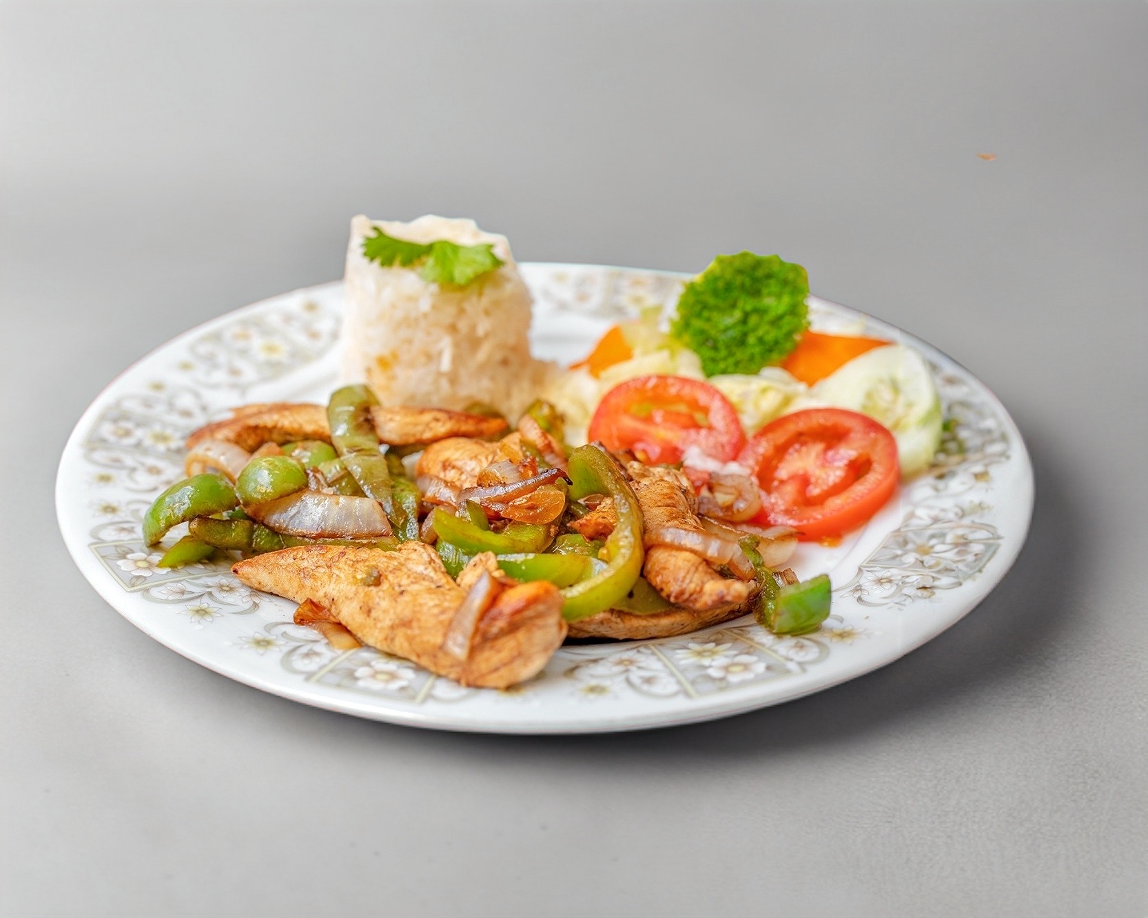 Fajitas de pollo elaboradas con pechuga de pollo, pimiento verde y cebolla, acompañadas de arroz, frijol y ensalada de vegetales.