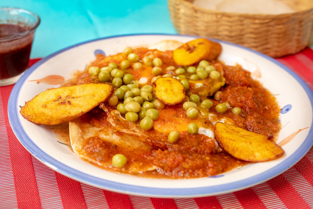 Huevos Fritos (2) sobre tortilla y frijol, con jamón y queso picado, plátanos fritos y bañados en salsa roja de tomate.