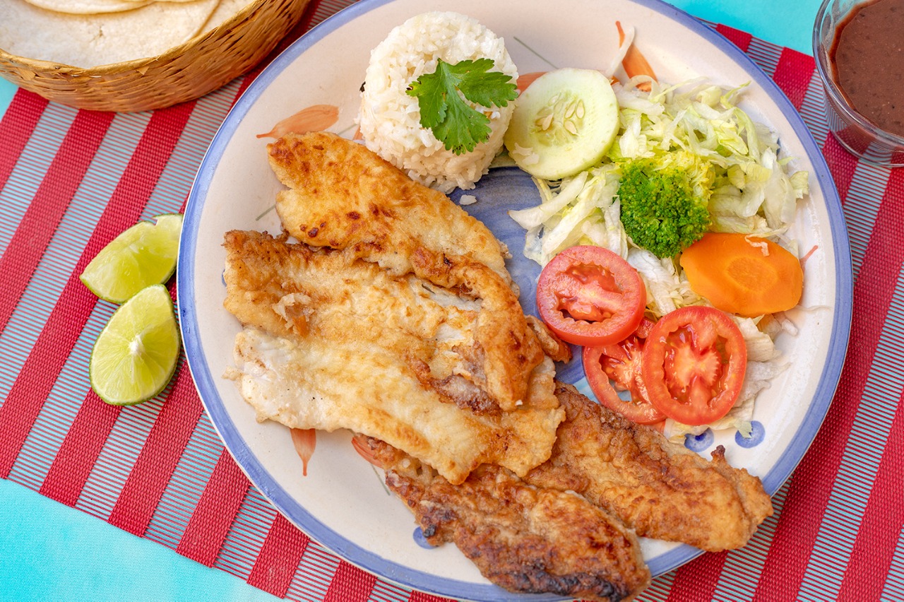 Filete de pescado empanizado, acompañado de arroz, frijol y ensalada de vegetales.