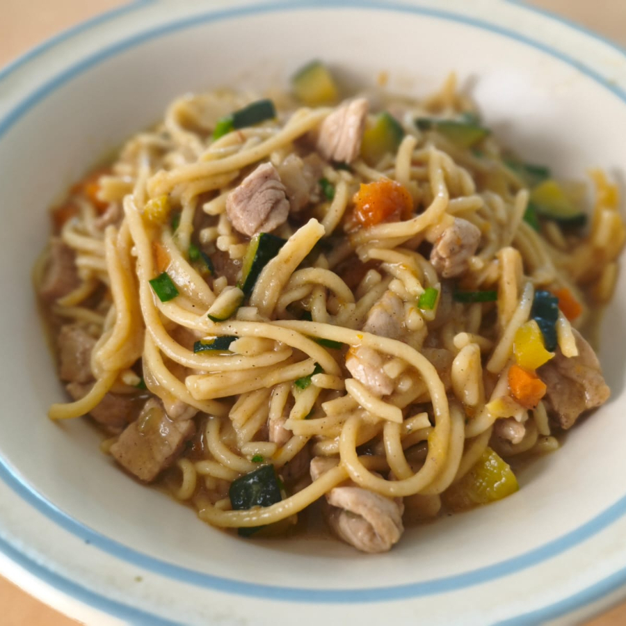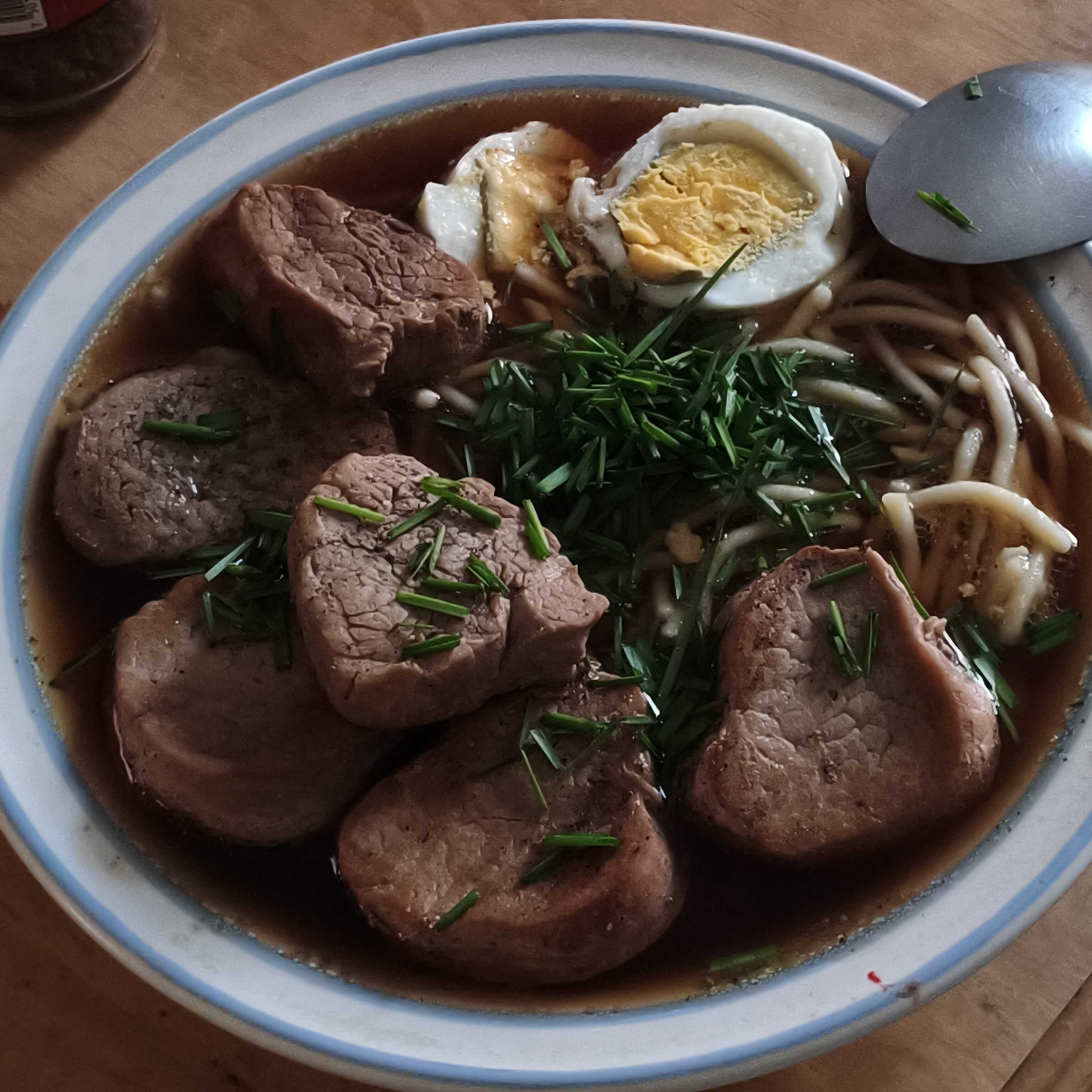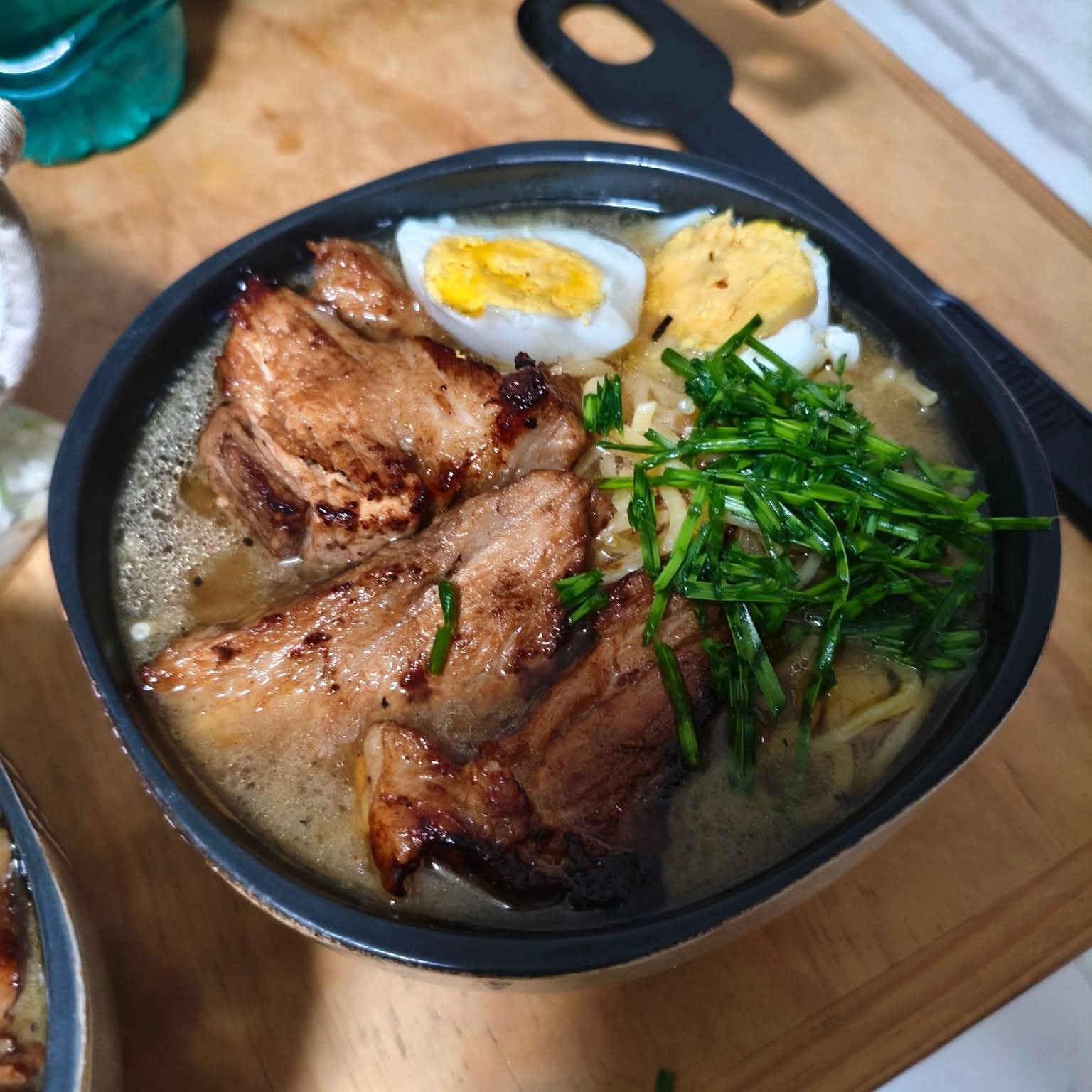 3 porciones de carne de cerdo, 1 tamago, cebollín, fideos y caldo.