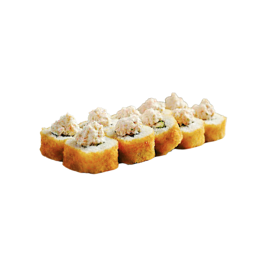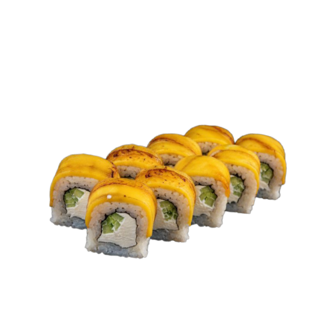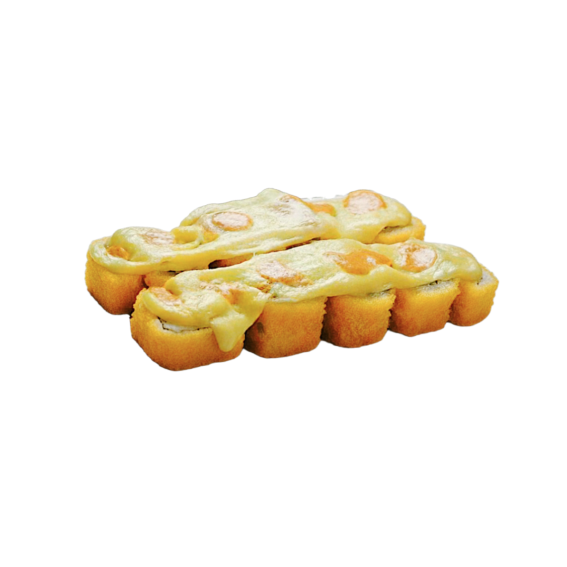 Relleno de Philadelphia, aguacate y camarón empanizado. Por fuera, queso gratinado y salsa spicy.