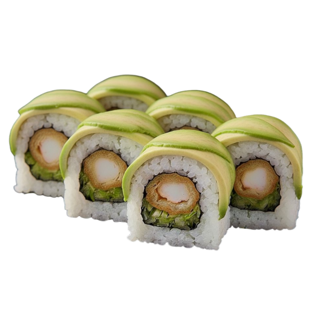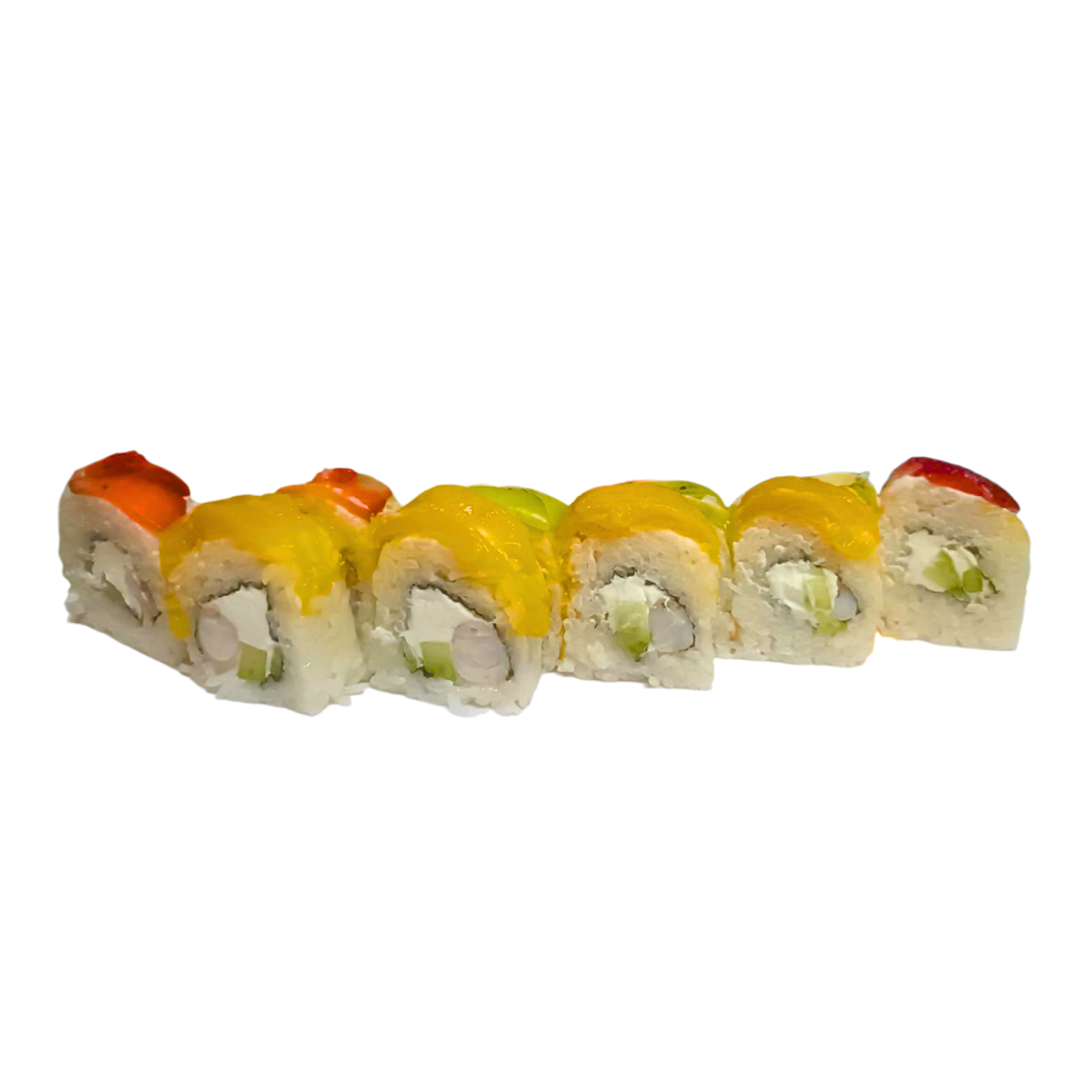 Relleno de aguacate, pepino y Philadelphia, con proteína a elegir (camarón, pollo, arrachera o salmón). Cobertura de ajonjolí blanco.
