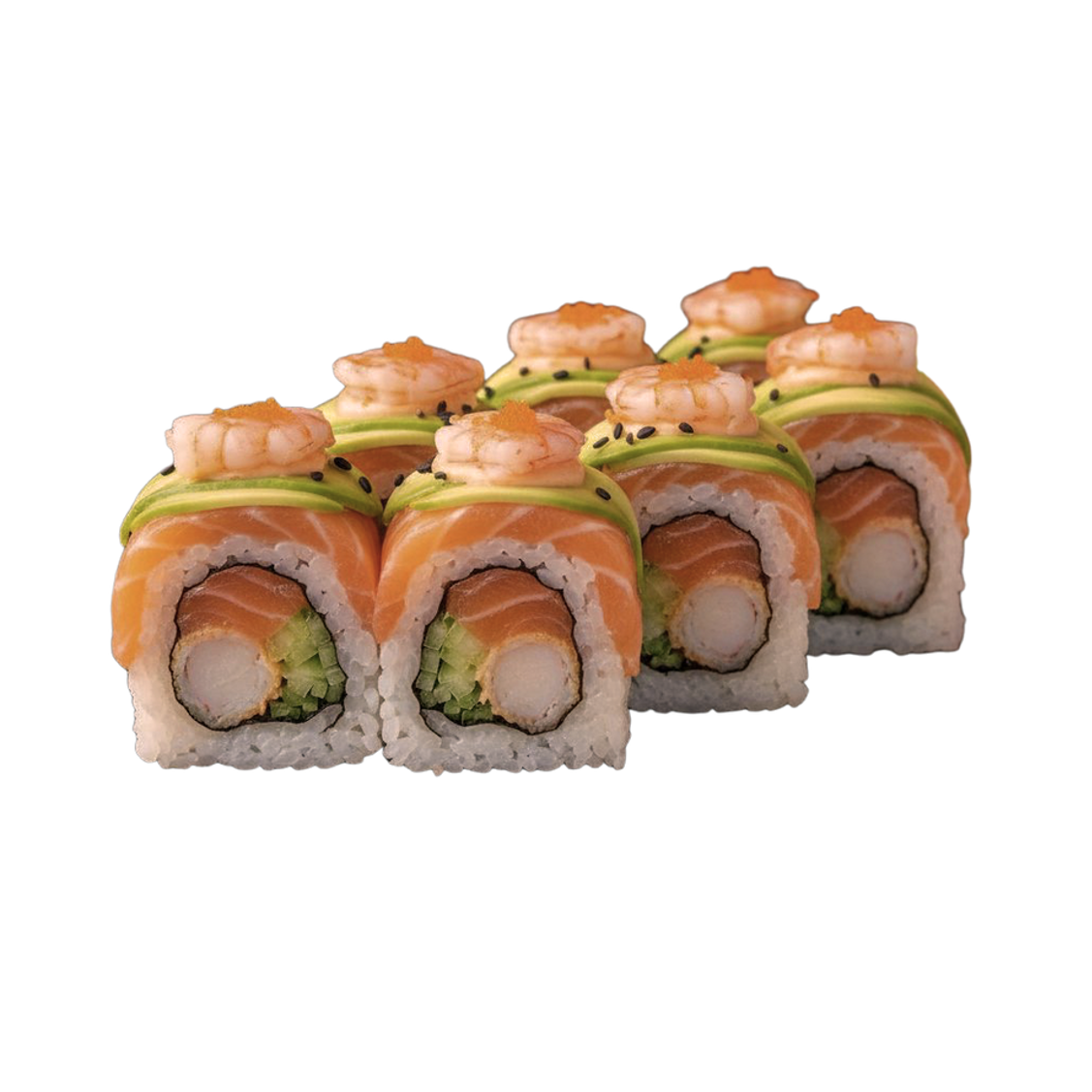 Relleno de salmón, aguacate, camarón y pepino. Cubierto de salmón, aguacate y camarón.