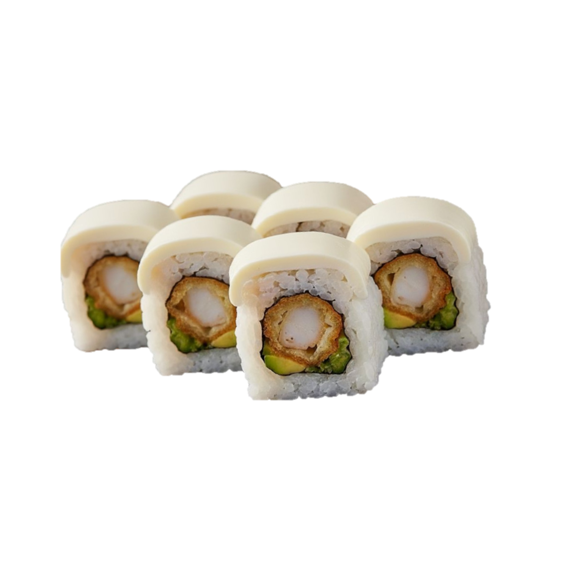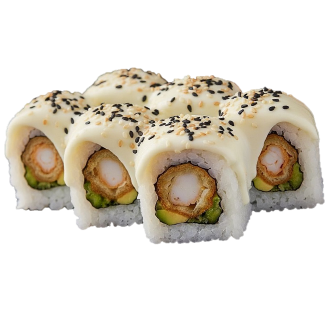 Relleno de Philadelphia, camarón empanizado y aguacate. Cubierto de Philadelphia y ajonjolí.