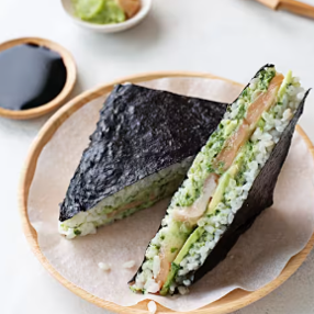 Rollo de sushi frito en formato sándwich, relleno de aguacate, Philadelphia y camarón. Acompañado de salsa spicy.