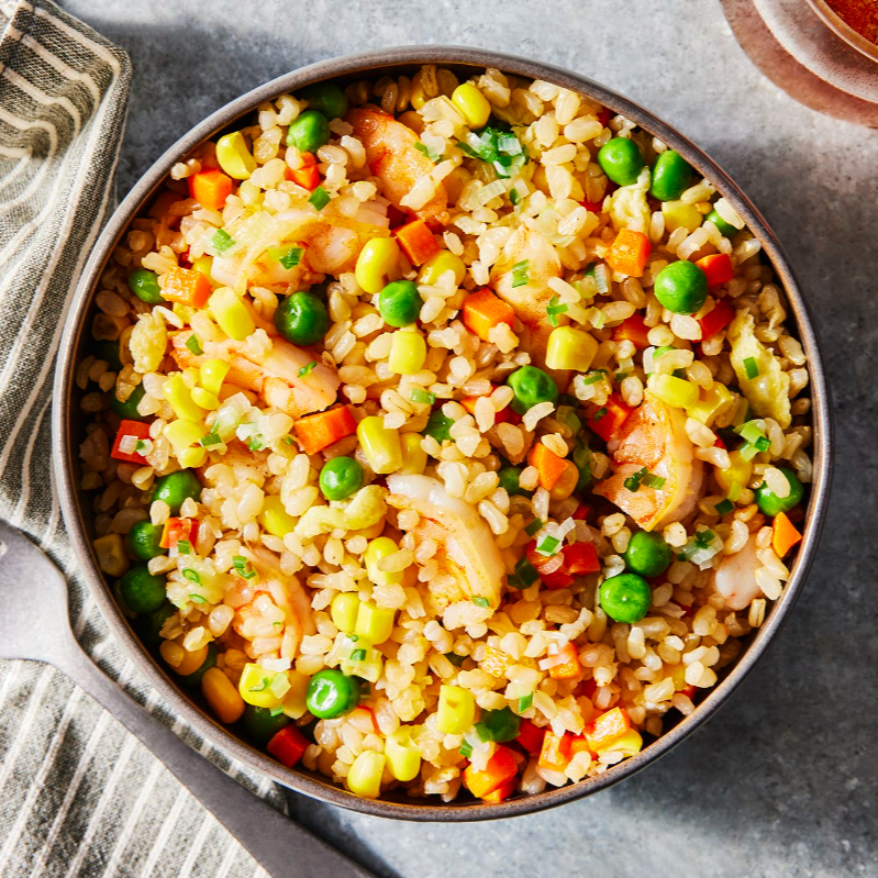 Arroz frito con camarón y vegetales (zanahoria y calabaza italiana).