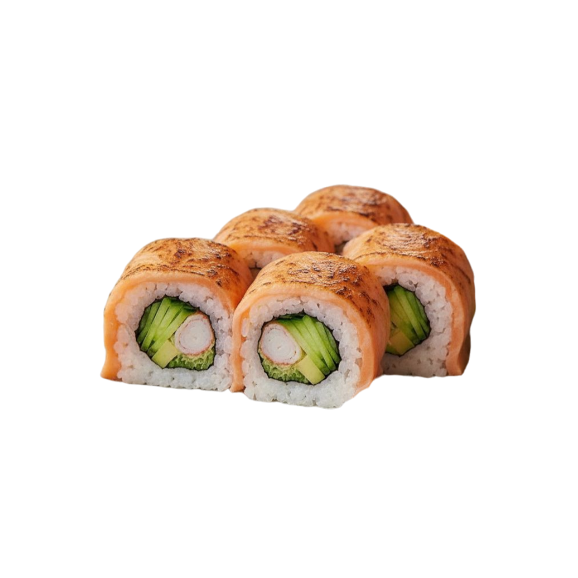 Relleno de aguacate, pepino, camarón empanizado y sriracha. Cubierta de salmón flameado con toques de sriracha.