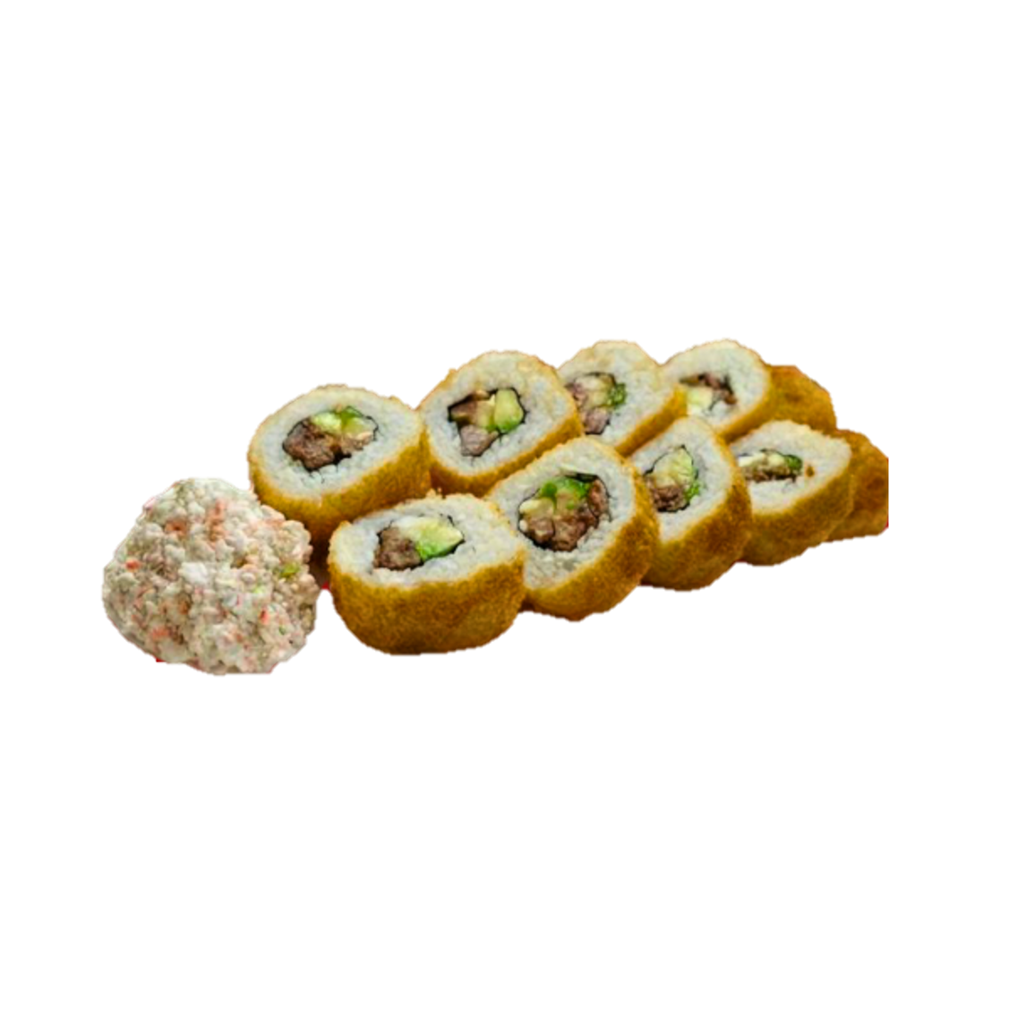 Rollo de sushi frito en formato sándwich, relleno de aguacate, Philadelphia y arrachera. Acompañado de salsa spicy.