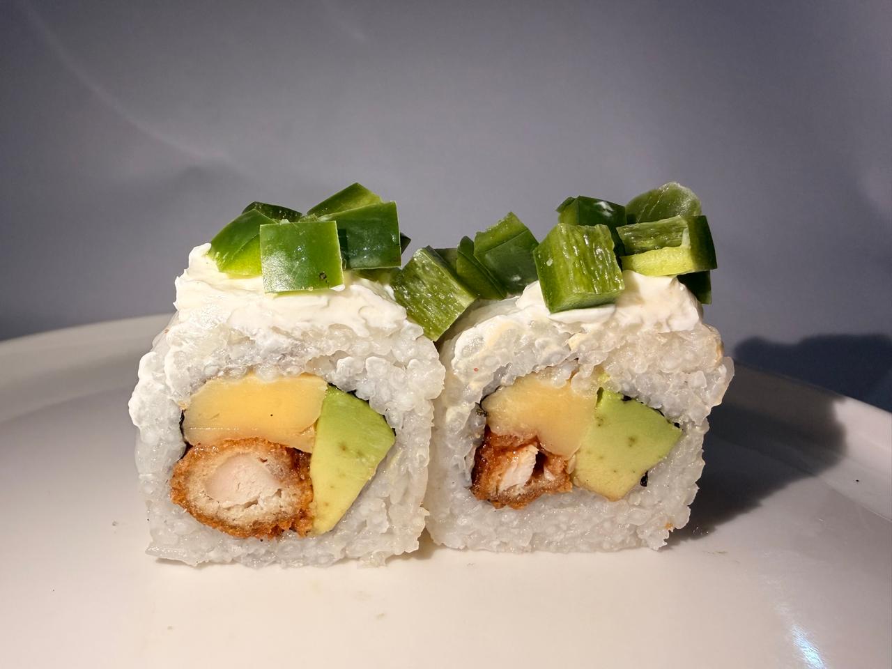 Camarón tempura, Philadelphia y chipotle, por fuera Philadelphia y cubos de jalapeño.