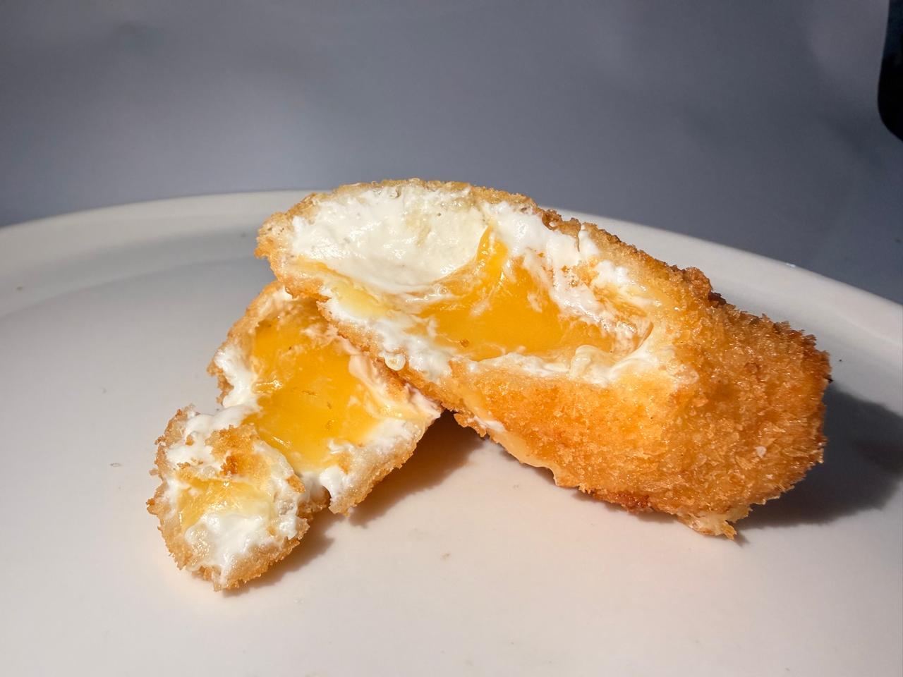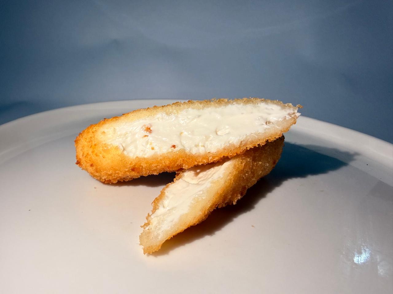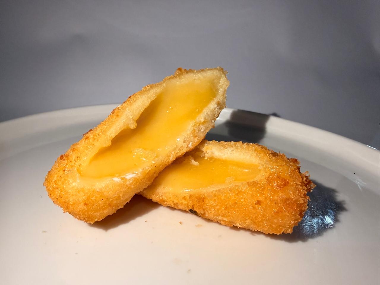 Brocheta frita rellena de mezcla de quesos.