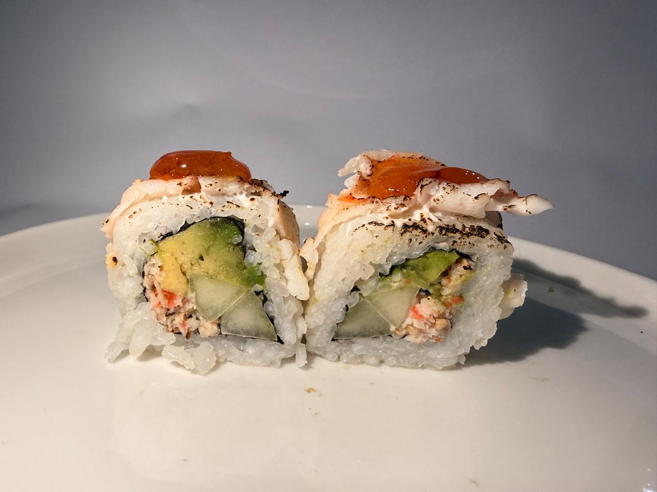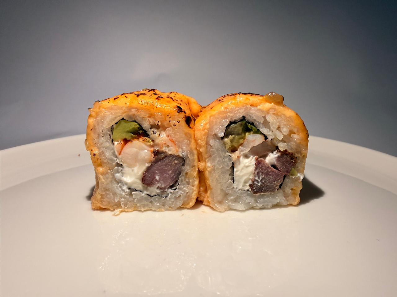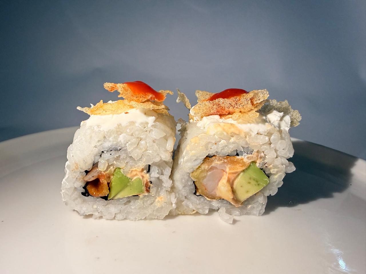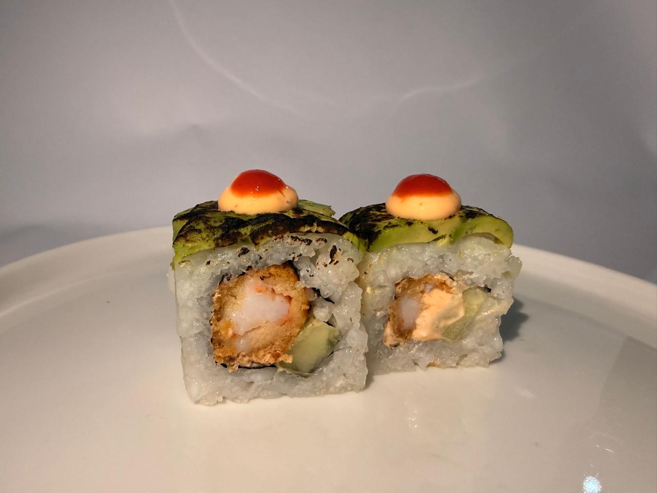 Camarón empanizado, Philadelphia, chipotle y aguacate, por fuera aguacate flambeado y sriracha.