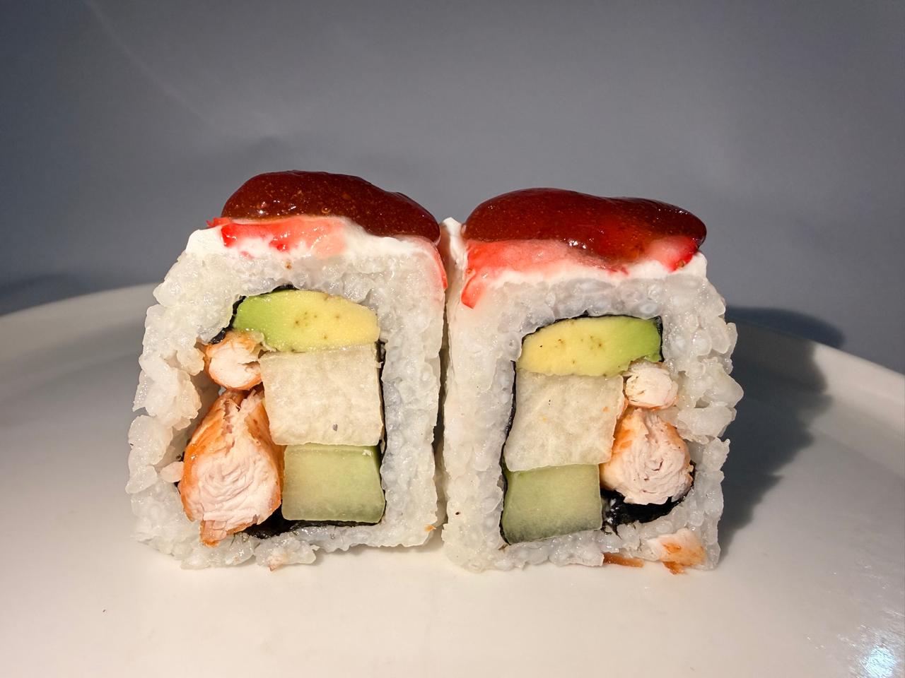 Jícama, pepino, aguacate y pollo a la plancha, por fuera Philadelphia, fresa y mermelada de fresa.