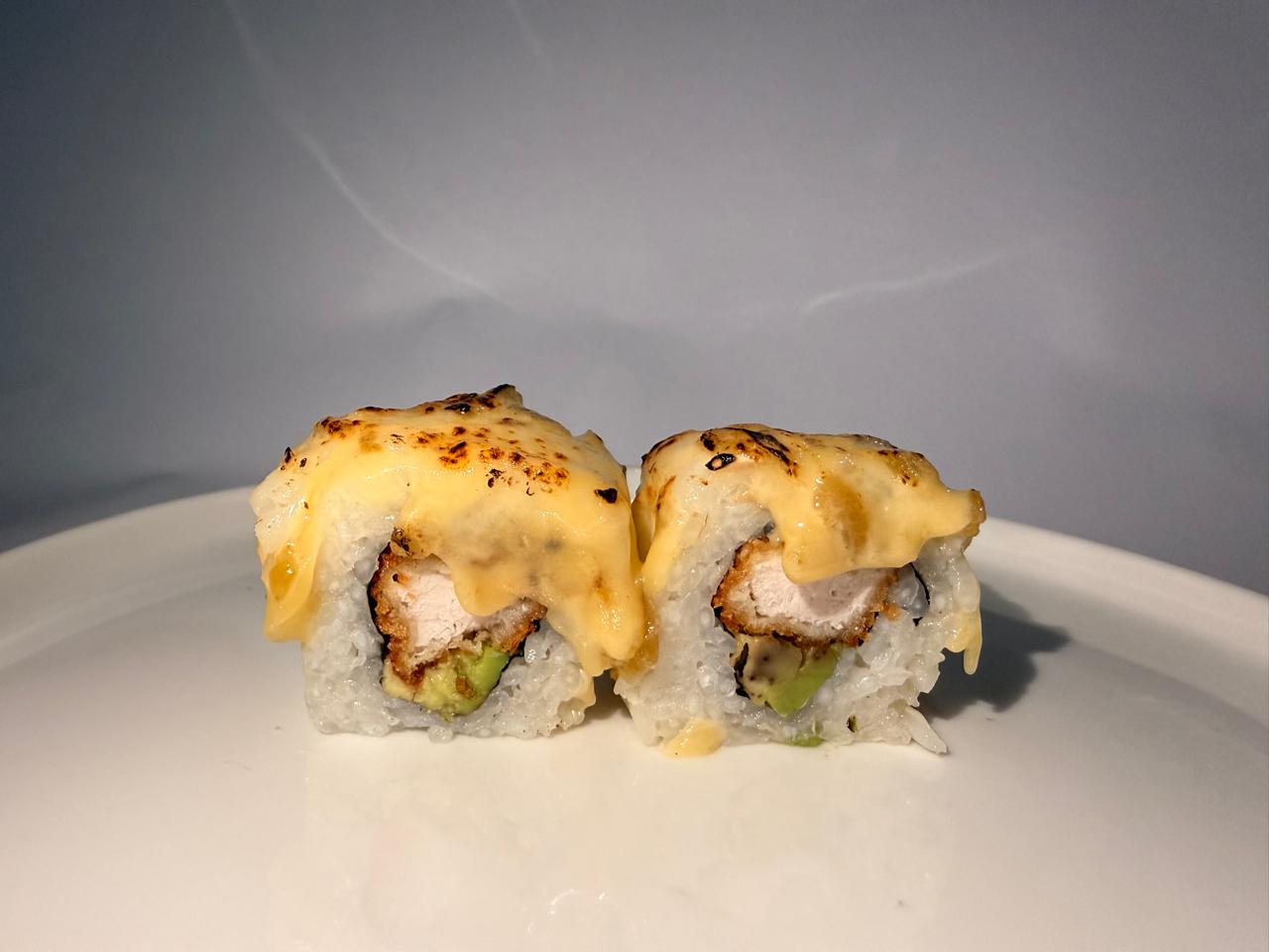 Arrachera, Philadelphia, camarón natural y aguacate, por fuera queso spicy.