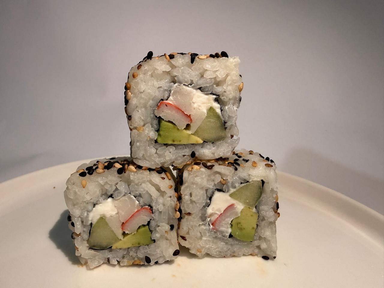 Surimi, aguacate, pepino y Philadelphia, por fuera ajonjolí mixto.