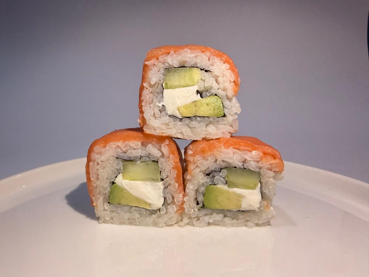 Aguacate, Philadelphia y pepino, por fuera salmón.