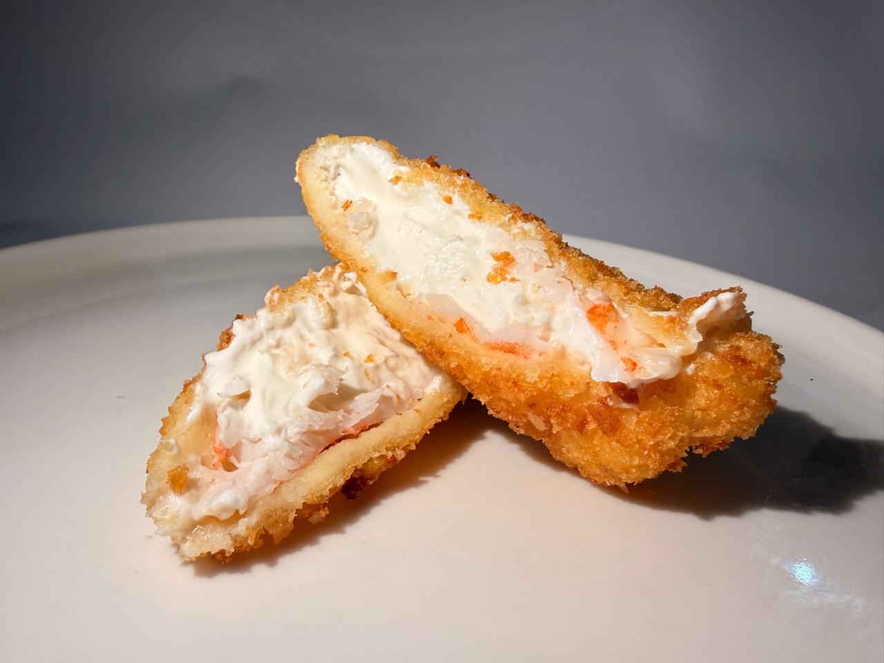 Brocheta frita rellena de queso Philadelphia y camarón.