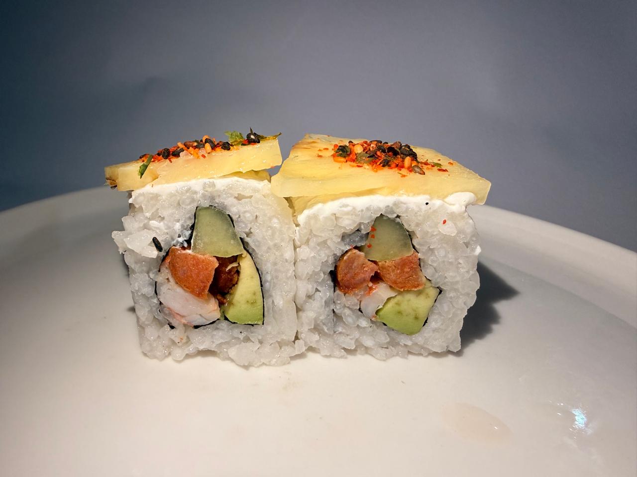 Piña, tocino, camarón empanizado y Philadelphia, por fuera aguacate y ajonjolí negro.