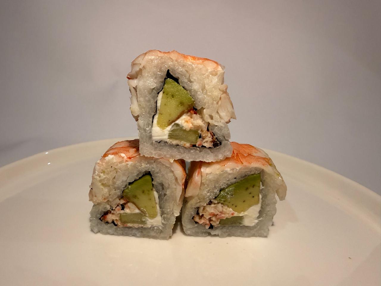 Philadelphia, aguacate y tampico, por fuera camarón natural.